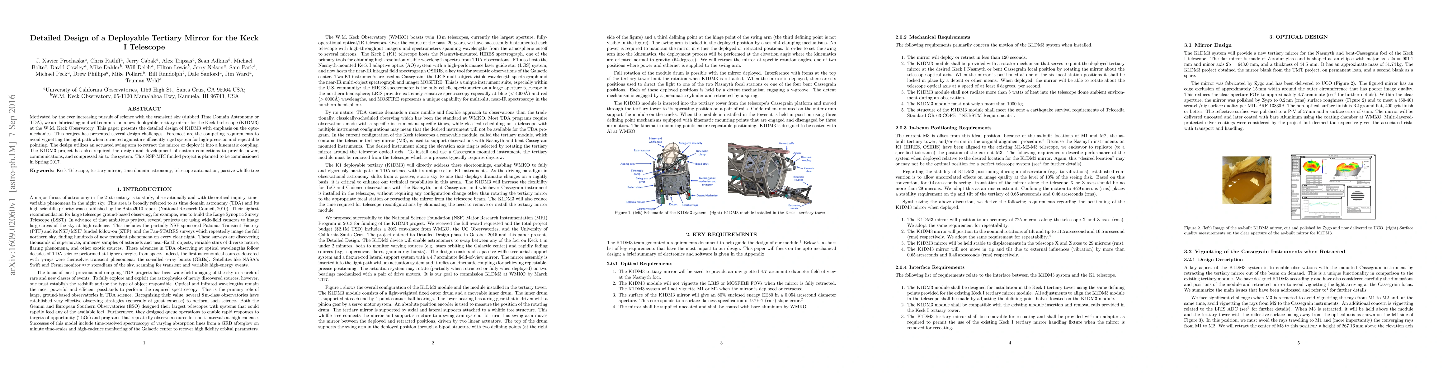 Motivated by the ever increasing pursuit of science with the transient sky (dubbed Time Domain Astronomy or TDA), we are fabricating and will commission a new deployable tertiary mirror for the Keck I telescope (K1DM3) at the W.M. Keck Observatory. This paper presents the detailed design of K1DM3 with emphasis on the opto-mechanics. This project has presented several design challenges. Foremost are the competing requirements to avoid vignetting the light path when retracted against a sufficiently rigid system for high-precision and repeatable pointing. The design utilizes an actuated swing arm to retract the mirror or deploy it into a kinematic coupling. The K1DM3 project has also required the design and development of custom connections to provide power, communications, and compressed air to the system. This NSF-MRI funded project is planned to be commissioned in Spring 2017.