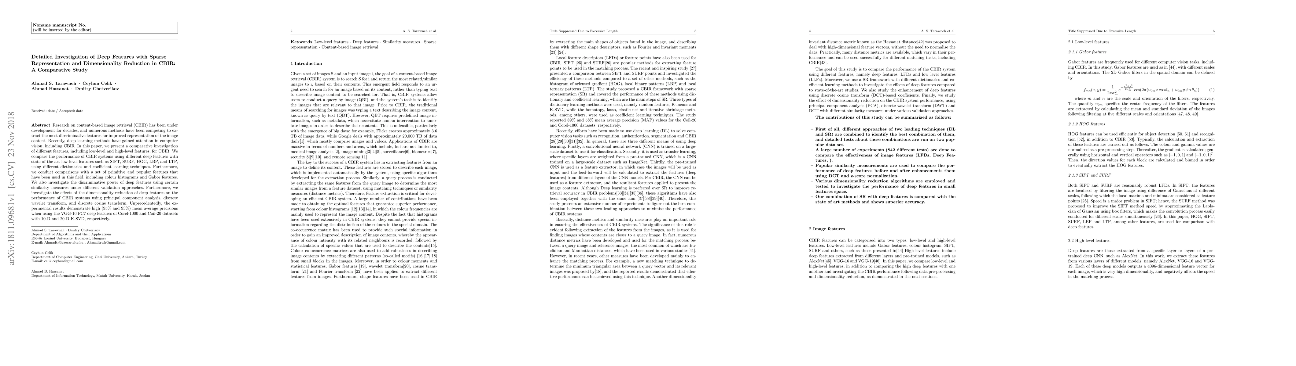 This paper conducts a comparative study on the effectiveness of deep features versus traditional low-level features in content-based image retrieval (CBIR), evaluating the performance using various dimensionality reduction techniques and similarity measures. Experimental results show superior performance of deep features, particularly VGG-16 FC7, achieving high mean average precisions.