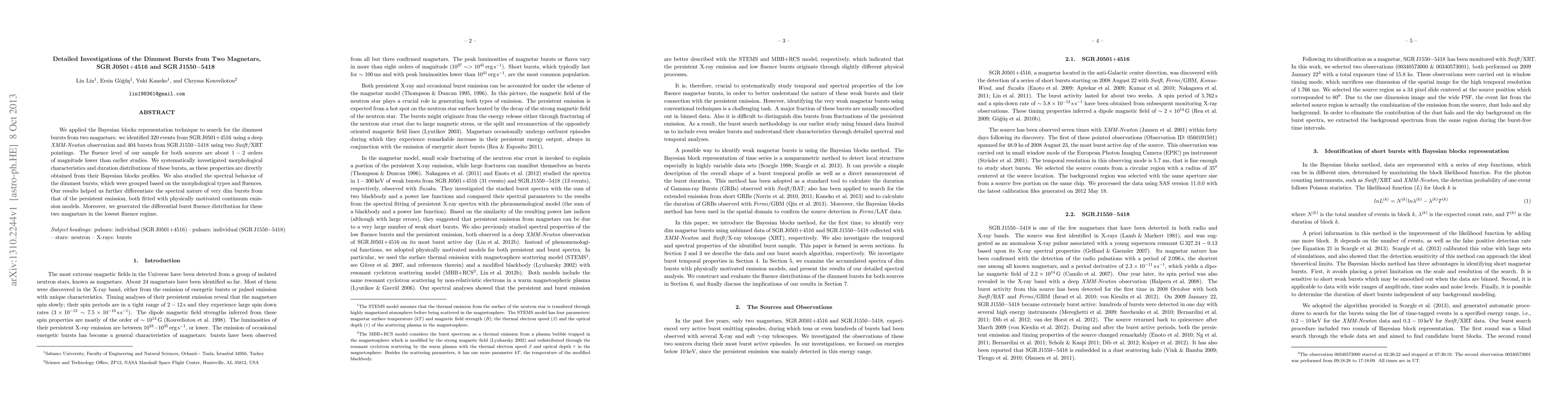 We applied the Bayesian blocks representation technique to search for the dimmest bursts from two magnetars: we identified 320 events from SGR J0501+4516 using a deep XMM-Newton observation and 404 bursts from SGR J1550-5418 using two Swift/XRT pointings. The fluence level of our sample for both sources are about 1-2 orders of magnitude lower than earlier studies. We systematically investigated morphological characteristics and duration distributions of these bursts, as these properties are directly obtained from their Bayesian blocks profiles. We also studied the spectral behavior of the dimmest bursts, which were grouped based on the morphological types and fluences. Our results helped us further differentiate the spectral nature of very dim bursts from that of the persistent emission, both fitted with physically motivated continuum emission models. Moreover, we generated the differential burst fluence distribution for these two magnetars in the lowest fluence regime.