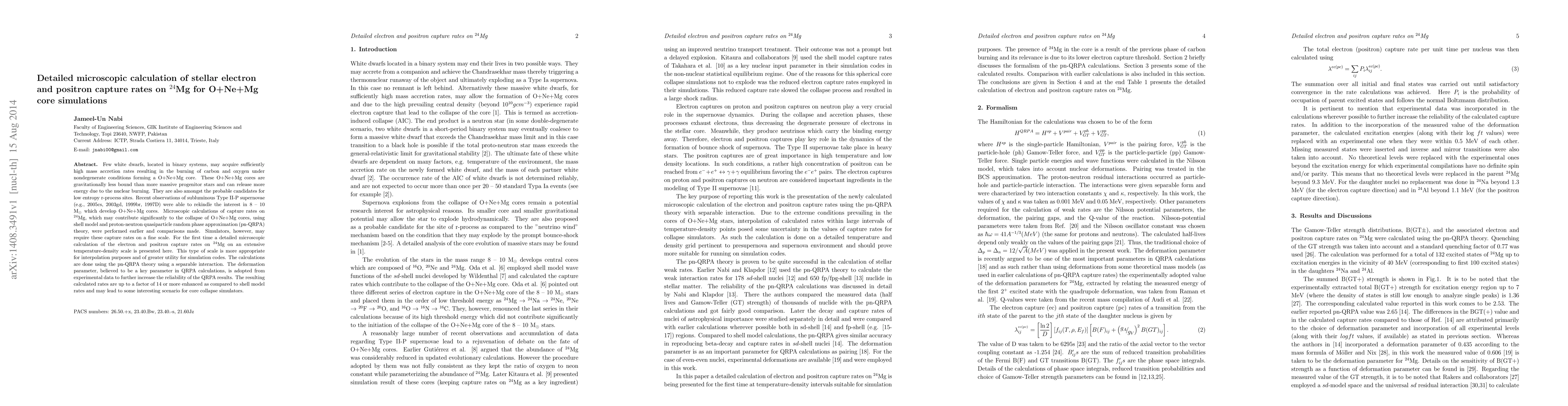 This paper presents detailed microscopic calculations of electron and positron capture rates on $^{24}$Mg using pn-QRPA theory, crucial for O+Ne+Mg core simulations in white dwarfs. The results, enhanced by a factor of 14 or more compared to shell model rates, provide a more accurate scale for core collapse simulations.