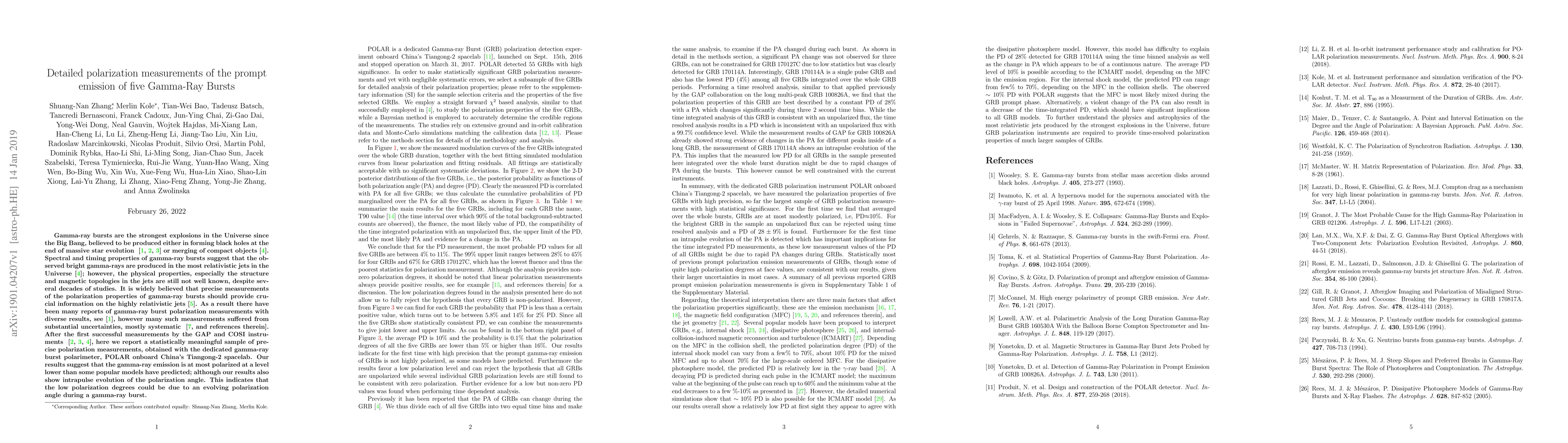 This paper reports precise polarization measurements of five gamma-ray bursts using the POLAR instrument on China's Tiangong-2, revealing that the gamma-ray emission is less polarized than predicted by some models, suggesting an evolving polarization angle during the bursts.