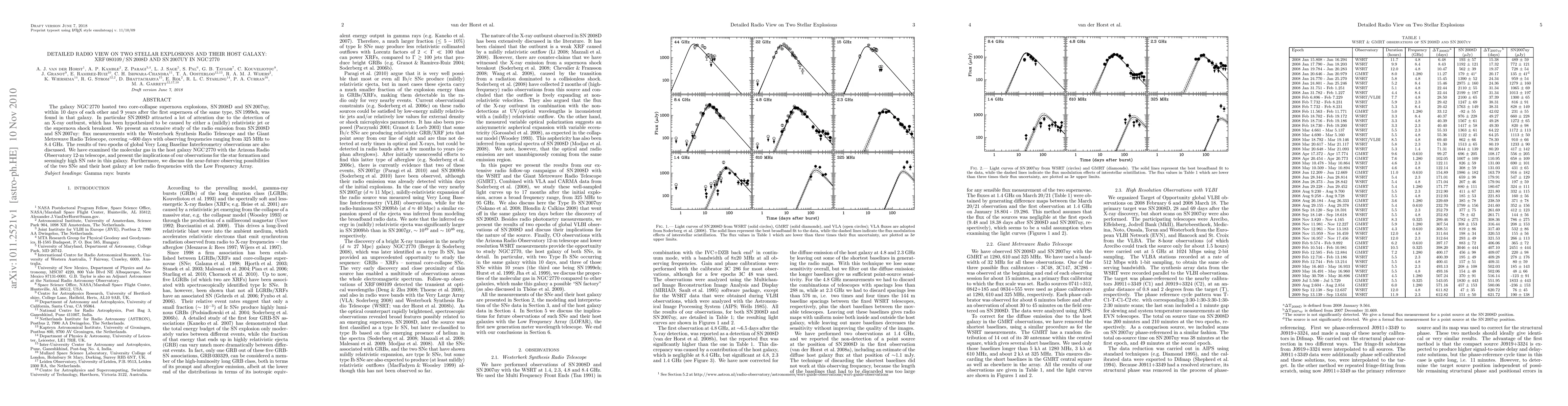 The galaxy NGC2770 hosted two core-collapse supernova explosions, SN2008D and SN2007uy, within 10 days of each other and 9 years after the first supernova of the same type, SN1999eh, was found in that galaxy. In particular SN2008D attracted a lot of attention due to the detection of an X-ray outburst, which has been hypothesized to be caused by either a (mildly) relativistic jet or the supernova shock breakout. We present an extensive study of the radio emission from SN2008D and SN2007uy: flux measurements with the Westerbork Synthesis Radio Telescope and the Giant Metrewave Radio Telescope, covering ~600 days with observing frequencies ranging from 325 MHz to 8.4 GHz. The results of two epochs of global Very Long Baseline Interferometry observations are also discussed. We have examined the molecular gas in the host galaxy NGC2770 with the Arizona Radio Observatory 12-m telescope, and present the implications of our observations for the star formation and seemingly high SN rate in this galaxy. Furthermore, we discuss the near-future observing possibilities of the two SNe and their host galaxy at low radio frequencies with the Low Frequency Array.