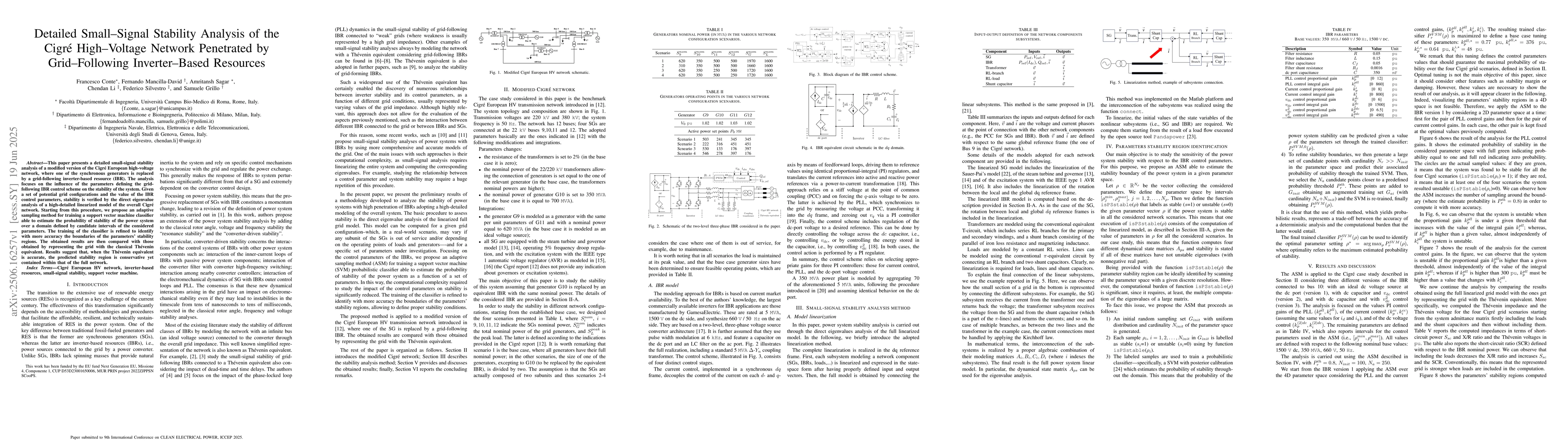 This paper presents a detailed small-signal stability analysis of a modified version of the Cigr\'e European high-voltage network, where one of the synchronous generators is replaced by a grid-following inverter-based resource (IBR). The analysis focuses on the influence of the parameters defining the grid-following IBR control scheme on the stability of the system. Given a set of potential grid configurations and the value of the IBR control parameters, stability is verified by the direct eigenvalue analysis of a high-detailed linearized model of the overall Cigr\'e network. Starting from this procedure, we propose an adaptive sampling method for training a support vector machine classifier able to estimate the probability of stability of the power system over a domain defined by candidate intervals of the considered parameters. The training of the classifier is refined to identify with more accuracy the boundaries of the parameters' stability regions. The obtained results are then compared with those obtained by representing the grid with the classical Th\'evenin equivalent. Results suggest that, when the Th\'evenin equivalent is accurate, the predicted stability region is conservative yet contained within that of the full network.