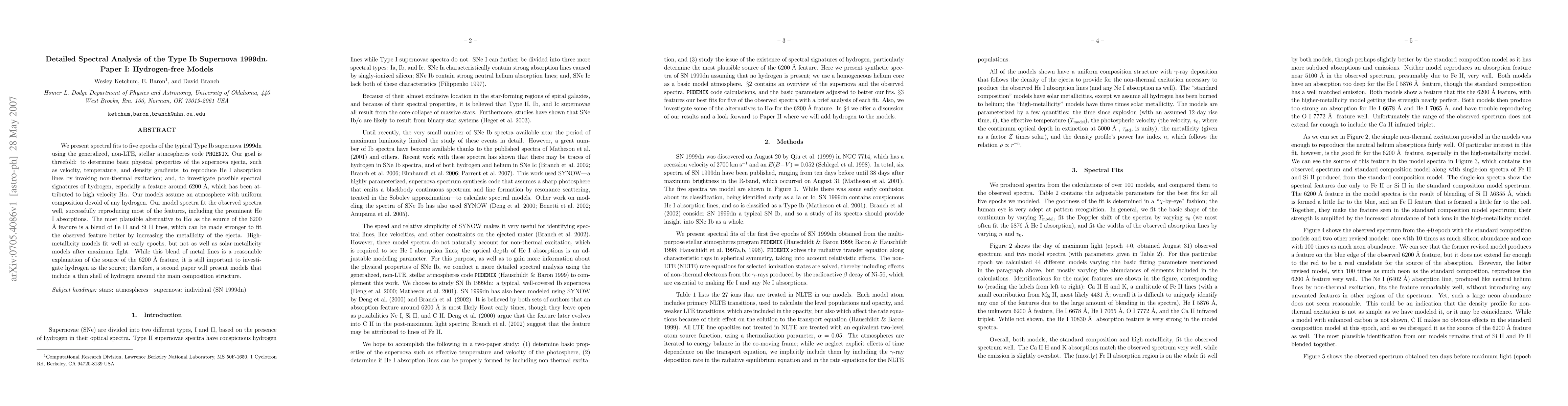 We present spectral fits to five epochs of the typical Type Ib supernova 1999dn using the generalized, non-LTE, stellar atmospheres code PHOENIX. Our goal is threefold: to determine basic physical properties of the supernova ejecta, such as velocity, temperature, and density gradients; to reproduce He I absorption lines by invoking non-thermal excitation; and, to investigate possible spectral signatures of hydrogen, especially a feature around 6200 Angstrom, which has been attributed to high velocity $H_\alpha$. Our models assume an atmosphere with uniform composition devoid of any hydrogen. Our model spectra fit the observed spectra well, successfully reproducing most of the features, including the prominent He I absorptions. The most plausible alternative to $H_\alpha$ as the source of the 6200 Angstrom feature is a blend of Fe II and Si II lines, which can be made stronger to fit the observed feature better by increasing the metallicity of the ejecta. High-metallicity models fit well at early epochs, but not as well as solar-metallicity models after maximum light. While this blend of metal lines is a reasonable explanation of the source of the 6200 Angstrom feature, it is still important to investigate hydrogen as the source; therefore, a second paper will present models that include a thin shell of hydrogen around the main composition structure.