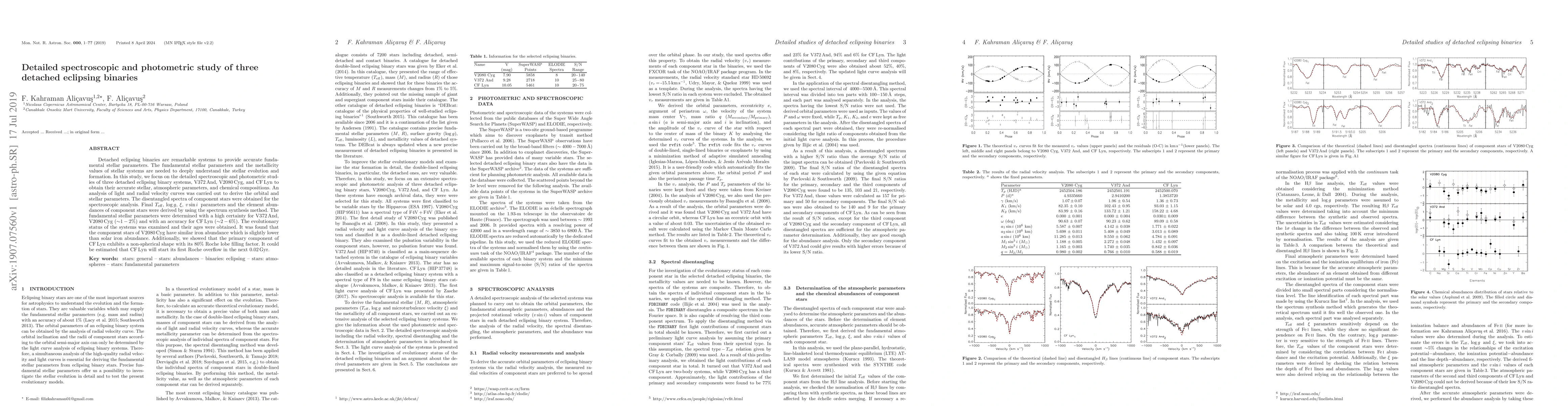 Detached eclipsing binaries are remarkable systems to provide accurate fundamental stellar parameters. The fundamental stellar parameters and the metallicity values of stellar systems are needed to deeply understand the stellar evolution and formation. In this study, we focus on the detailed spectroscopic and photometric studies of three detached eclipsing binary systems, V372\,And, V2080\,Cyg, and CF\,Lyn to obtain their accurate stellar, atmospheric parameters,and chemical compositions. An analysis of light and radial velocity curves was carried out to derive the orbital and stellar parameters. The disentangled spectra of component stars were obtained for the spectroscopic analysis. Final \teff, \logg, $\xi$, \vsini\, parameters and the element abundances of component stars were derived by using the spectrum synthesis method. The fundamental stellar parameters were determined with a high certainty for V372\,And, V2080\,Cyg ($\sim$$1-2$\%) and with an accuracy for CF\,Lyn ($\sim$$2-6$\%). The evolutionary status of the systems was examined and their ages were obtained. It was found that the component stars of V2080\,Cyg have similar iron abundance which is slightly lower than solar iron abundance. Additionally, we showed that the primary component of CF\,Lyn exhibits a non-spherical shape with its 80\% Roche lobe filling factor. It could be estimated that CF\,Lyn will start its first Roche overflow in the next 0.02\,Gyr.