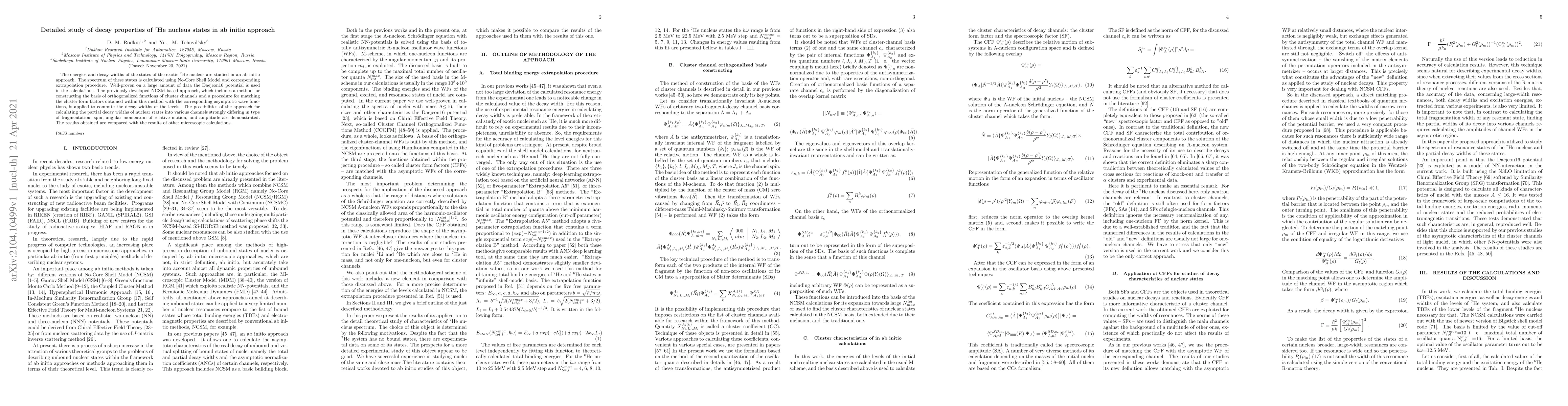 The energies and decay widths of the states of the exotic 7He nucleus are studied in an ab initio approach. The spectrum of these states is calculated using No-Core Shell Model and corresponding extrapolation procedure. Well-proven on a large amount of data the Daejeon16 potential is used in the calculations. The previously developed NCSM-based approach, which includes a method for constructing the basis of orthogonalized functions of cluster channels and a procedure for matching the cluster form factors obtained within this method with the corresponding asymptotic wave functions, is applied to compute the decay widths of the levels. The possibilities of the approach for calculating the partial decay widths of nuclear states into various channels strongly differing in type of fragmentation, spin, angular momentum of relative motion, and amplitude are demonstrated. The results obtained are compared with the results of other microscopic calculations.