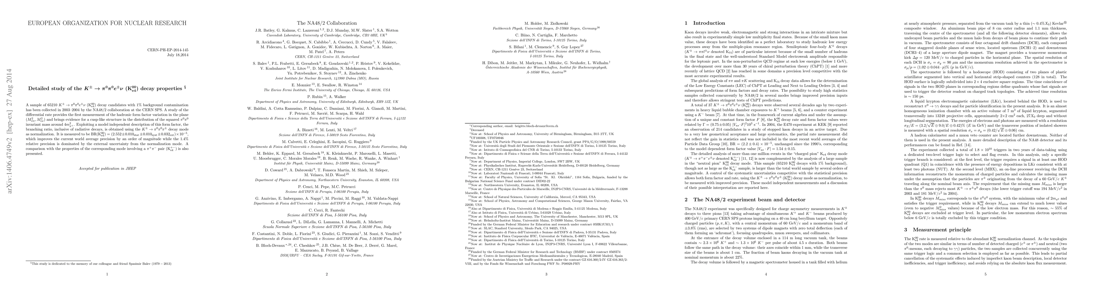 Researchers at NA48/2 collaboration measured the branching ratio of the K+ to pi0 pi0 e+ nu decay mode, obtaining a value of 2.552 x 10^-5 with an order of magnitude improvement over current world average precision.