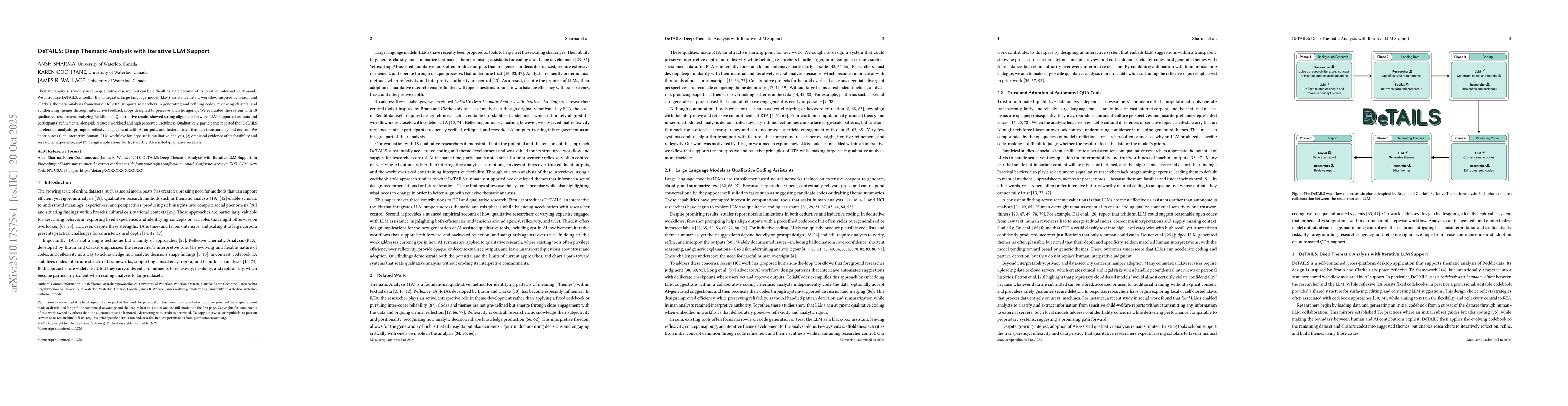 DeTAILS provides an interactive human-LLM workflow for large-scale qualitative analysis, integrating iterative feedback loops to support code generation, clustering, and theme synthesis.