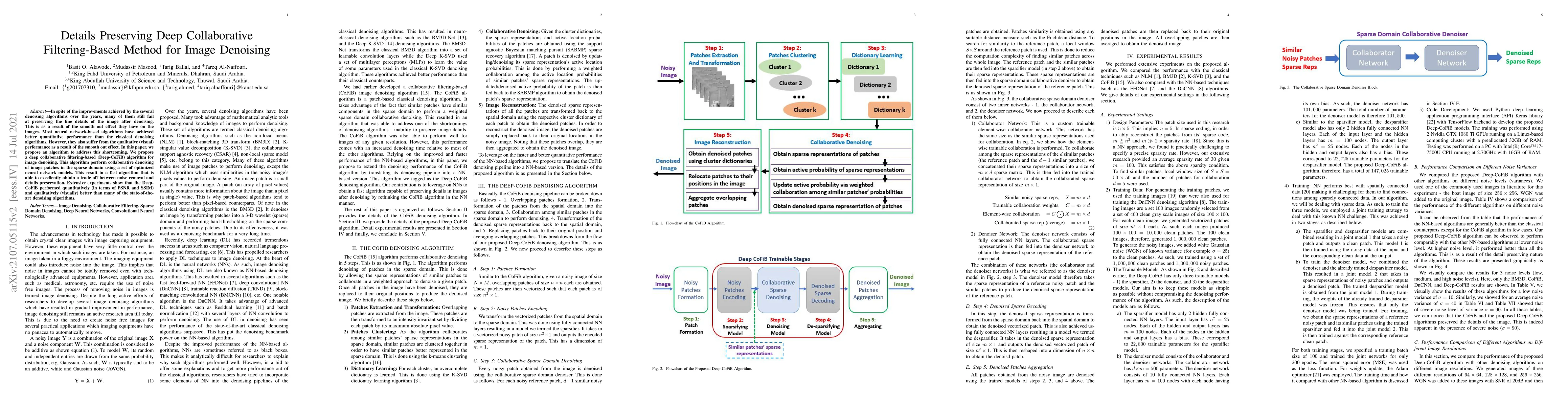 This paper proposes a Deep Collaborative Filtering-Based (Deep-CoFiB) method for image denoising that effectively balances noise removal and fine detail preservation, outperforming state-of-the-art algorithms both quantitatively and qualitatively.