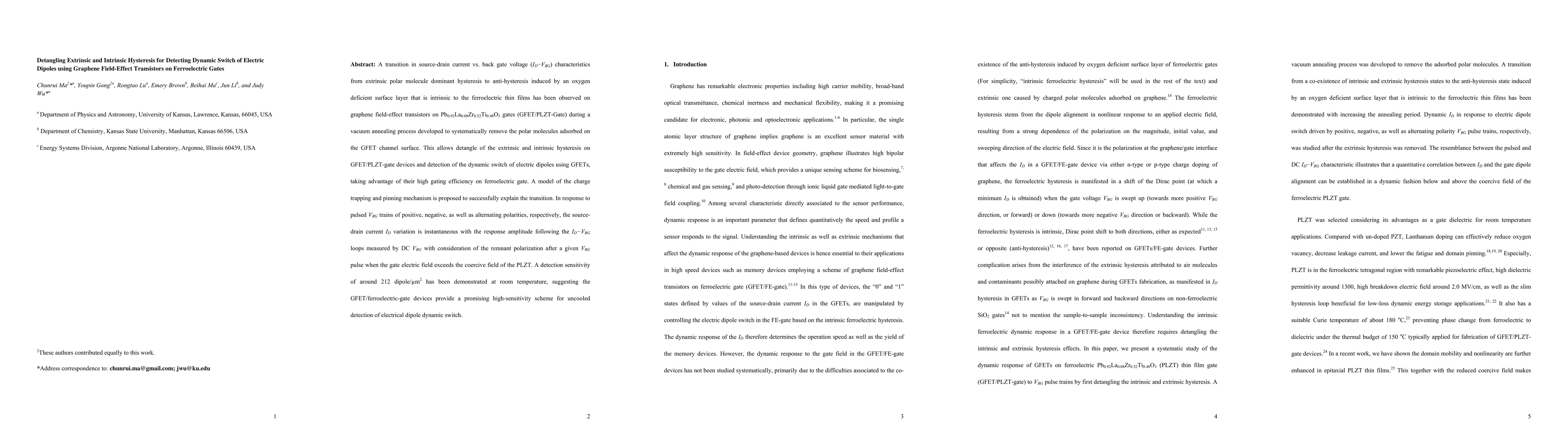 This study observes a transition from extrinsic to intrinsic hysteresis in graphene field-effect transistors on ferroelectric gates, revealing the dynamic switch of electric dipoles via a vacuum annealing process. The proposed model of charge trapping and pinning explains the current response, demonstrating a high detection sensitivity of 212 dipole/um² at room temperature.