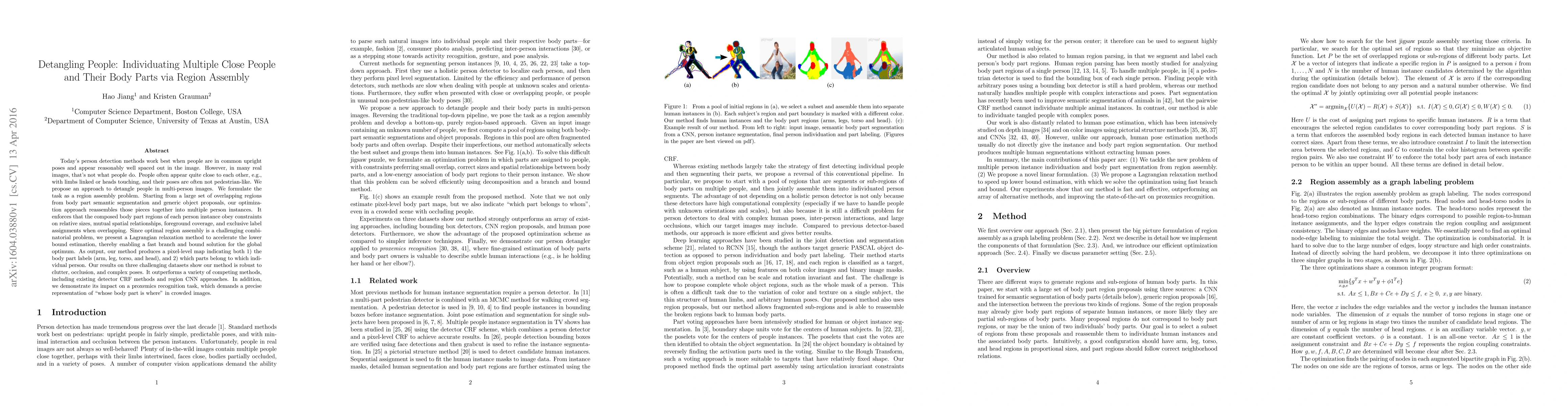 Today's person detection methods work best when people are in common upright poses and appear reasonably well spaced out in the image. However, in many real images, that's not what people do. People often appear quite close to each other, e.g., with limbs linked or heads touching, and their poses are often not pedestrian-like. We propose an approach to detangle people in multi-person images. We formulate the task as a region assembly problem. Starting from a large set of overlapping regions from body part semantic segmentation and generic object proposals, our optimization approach reassembles those pieces together into multiple person instances. It enforces that the composed body part regions of each person instance obey constraints on relative sizes, mutual spatial relationships, foreground coverage, and exclusive label assignments when overlapping. Since optimal region assembly is a challenging combinatorial problem, we present a Lagrangian relaxation method to accelerate the lower bound estimation, thereby enabling a fast branch and bound solution for the global optimum. As output, our method produces a pixel-level map indicating both 1) the body part labels (arm, leg, torso, and head), and 2) which parts belong to which individual person. Our results on three challenging datasets show our method is robust to clutter, occlusion, and complex poses. It outperforms a variety of competing methods, including existing detector CRF methods and region CNN approaches. In addition, we demonstrate its impact on a proxemics recognition task, which demands a precise representation of "whose body part is where" in crowded images.