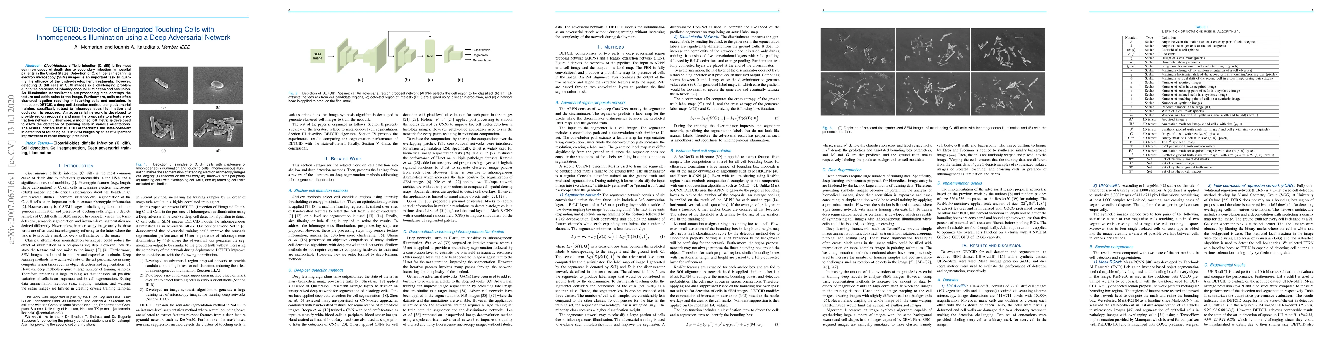 DETCID employs a deep adversarial network to detect elongated touching cells in SEM images of Clostridioides difficile, overcoming challenges of inhomogeneous illumination and occlusion. The method significantly improves mean average precision by at least 20 percent over existing techniques.