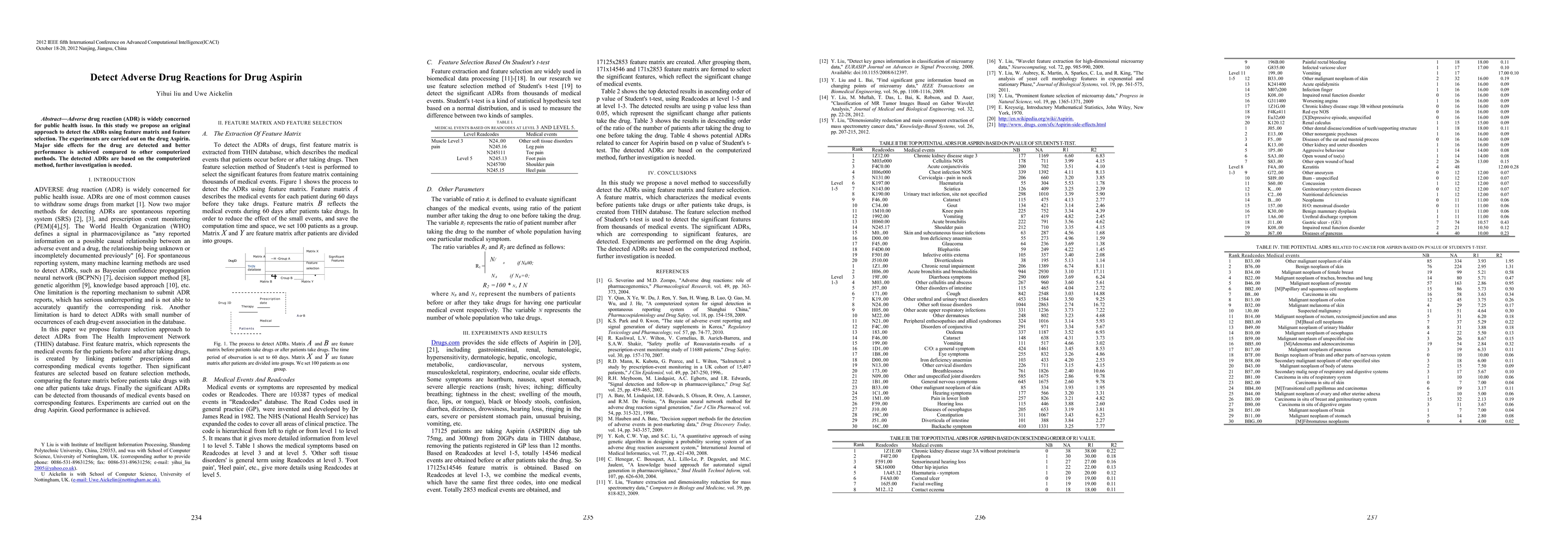 This study proposes a novel approach to detect adverse drug reactions (ADRs) for Aspirin using feature matrix and selection, achieving better performance than other methods. The detected ADRs require further investigation, highlighting the need for validation.