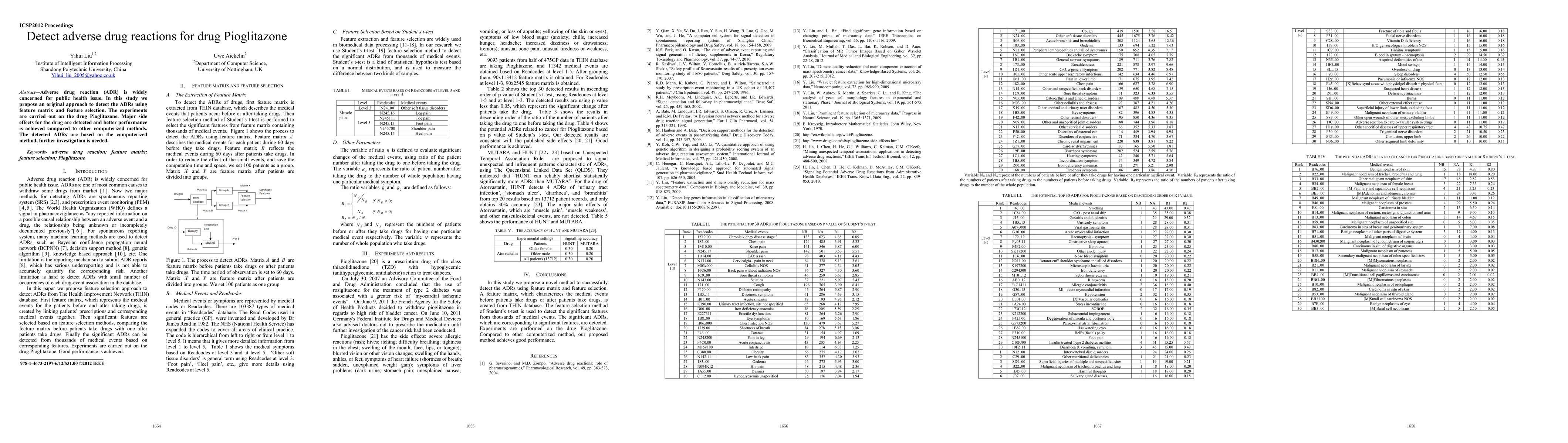 This research introduces a new method to identify adverse drug reactions (ADRs) for the drug Pioglitazone. It uses a feature matrix from the THIN database and Student's t-test for feature selection, outperforming other computerized methods in detecting significant ADRs.