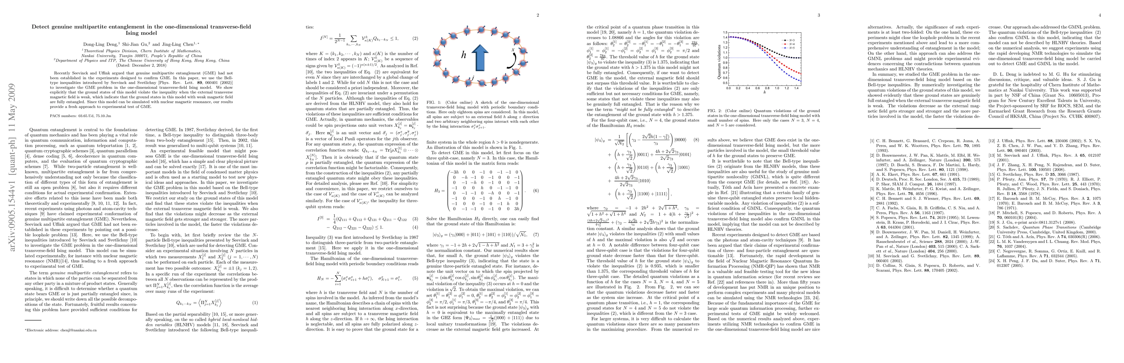 This paper investigates genuine multipartite entanglement (GME) in the one-dimensional transverse-field Ising model using Bell-type inequalities. It demonstrates that the model's ground states exhibit GME under weak magnetic fields, providing a new experimental approach via nuclear magnetic resonance simulations.