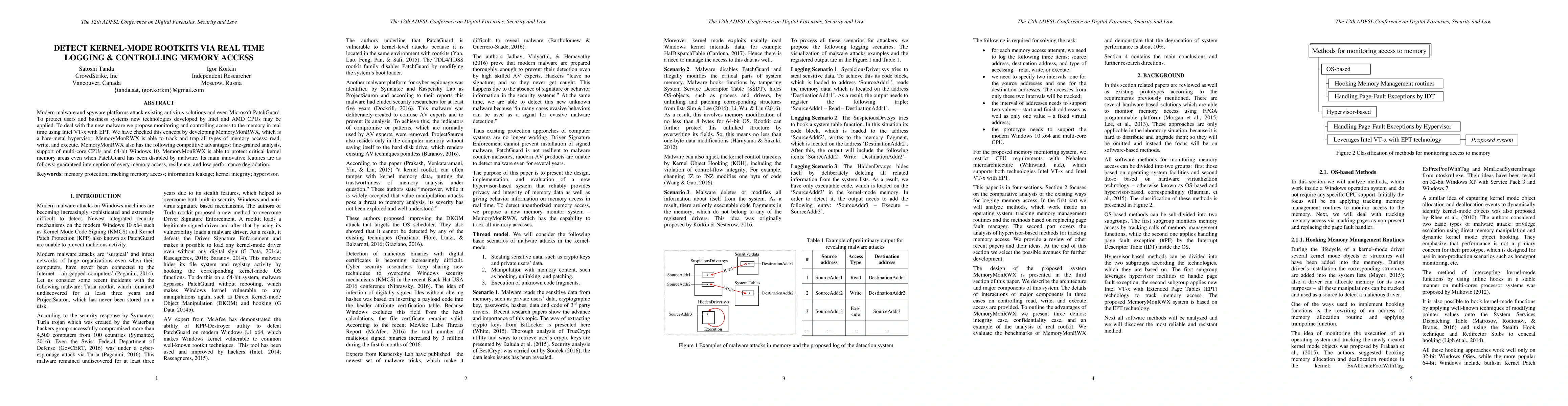 This paper proposes a novel approach to detecting kernel-mode rootkits using real-time logging and controlling memory access via Intel VT-x with EPT. The developed MemoryMonRWX bare-metal hypervisor offers fine-grained analysis, supports multi-core CPUs, and protects critical kernel memory areas even when PatchGuard is disabled, achieving low performance degradation.