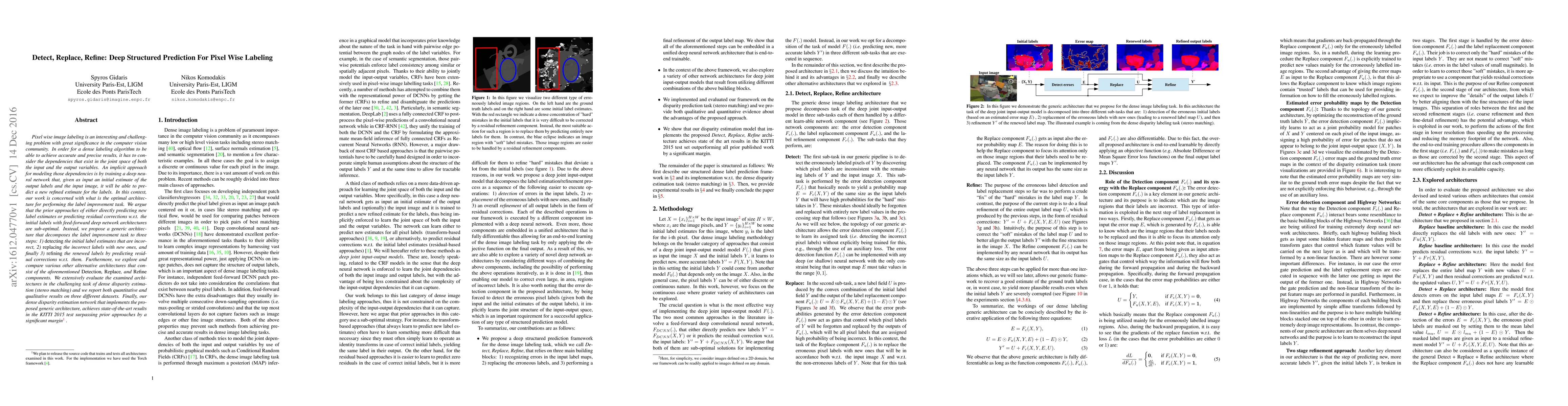 Pixel wise image labeling is an interesting and challenging problem with great significance in the computer vision community. In order for a dense labeling algorithm to be able to achieve accurate and precise results, it has to consider the dependencies that exist in the joint space of both the input and the output variables. An implicit approach for modeling those dependencies is by training a deep neural network that, given as input an initial estimate of the output labels and the input image, it will be able to predict a new refined estimate for the labels. In this context, our work is concerned with what is the optimal architecture for performing the label improvement task. We argue that the prior approaches of either directly predicting new label estimates or predicting residual corrections w.r.t. the initial labels with feed-forward deep network architectures are sub-optimal. Instead, we propose a generic architecture that decomposes the label improvement task to three steps: 1) detecting the initial label estimates that are incorrect, 2) replacing the incorrect labels with new ones, and finally 3) refining the renewed labels by predicting residual corrections w.r.t. them. Furthermore, we explore and compare various other alternative architectures that consist of the aforementioned Detection, Replace, and Refine components. We extensively evaluate the examined architectures in the challenging task of dense disparity estimation (stereo matching) and we report both quantitative and qualitative results on three different datasets. Finally, our dense disparity estimation network that implements the proposed generic architecture, achieves state-of-the-art results in the KITTI 2015 test surpassing prior approaches by a significant margin.