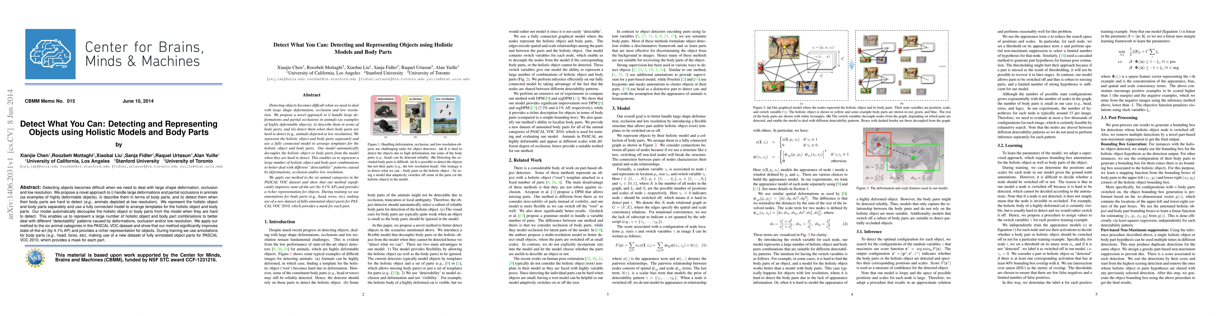 This paper proposes a novel approach to detect highly deformable objects like animals under conditions of large deformations, occlusion, and low resolution. It uses a holistic model and body part representation to improve detection accuracy and provides richer object representations, achieving a 4.1% improvement in state-of-the-art performance on the PASCAL VOC dataset.