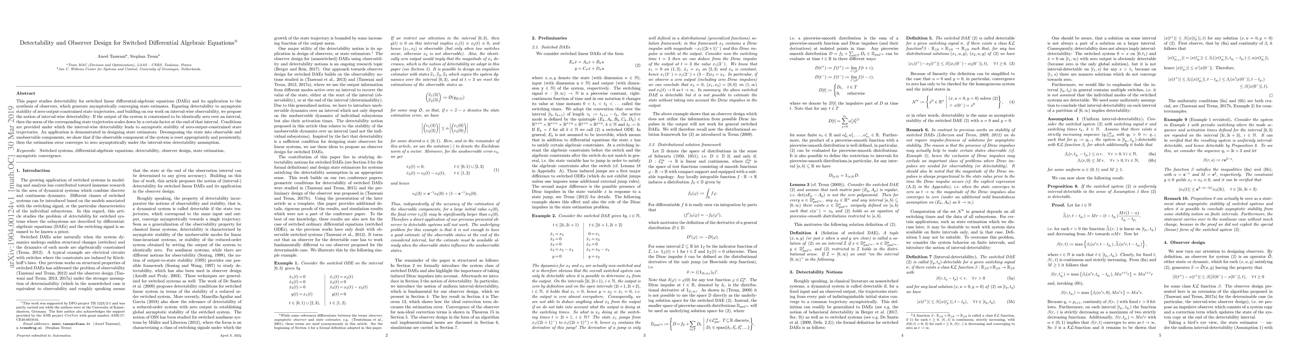 This paper investigates detectability for switched linear differential-algebraic equations and proposes interval-wise detectability for synthesizing observers that generate asymptotically converging state estimates. It demonstrates that appropriate resetting of the observable state component under interval-wise detectability leads to zero estimation error.