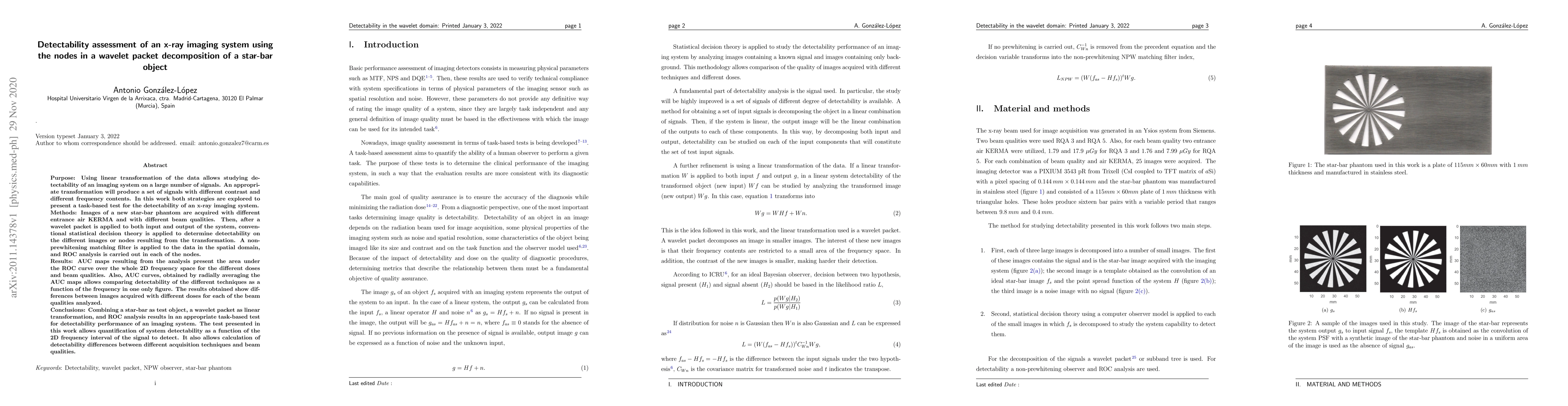 Purpose: Using linear transformation of the data allows studying detectability of an imaging system on a large number of signals. An appropriate transformation will produce a set of signals with different contrast and different frequency contents. In this work both strategies are explored to present a task-based test for the detectability of an x-ray imaging system. Methods: Images of a new star-bar phantom are acquired with different entrance air KERMA and with different beam qualities. Then, after a wavelet packet is applied to both input and output of the system, conventional statistical decision theory is applied to determine detectability on the different images or nodes resulting from the transformation. A non-prewhitening matching filter is applied to the data in the spatial domain, and ROC analysis is carried out in each of the nodes. Results: AUC maps resulting from the analysis present the area under the ROC curve over the whole 2D frequency space for the different doses and beam qualities. Also, AUC curves, obtained by radially averaging the AUC maps allows comparing detectability of the different techniques as a function of the frequency in one only figure. The results obtained show differences between images acquired with different doses for each of the beam qualities analyzed. Conclusions: Combining a star-bar as test object, a wavelet packet as linear transformation, and ROC analysis results in an appropriate task-based test for detectability performance of an imaging system. The test presented in this work allows quantification of system detectability as a function of the 2D frequency interval of the signal to detect. It also allows calculation of detectability differences between different acquisition techniques and beam qualities.