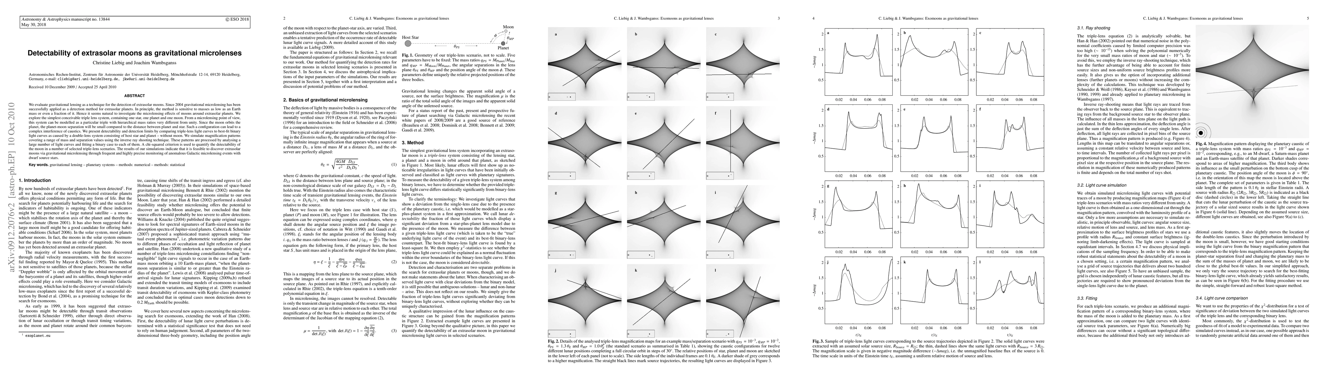 This paper evaluates gravitational microlensing as a method for detecting extrasolar moons, finding that it is feasible to discover them through precise monitoring of microlensing events, especially when dwarf stars are involved. Simulations show that complex interference of caustics in triple-lens systems can reveal the presence of moons, though detection limits depend on mass and separation values.