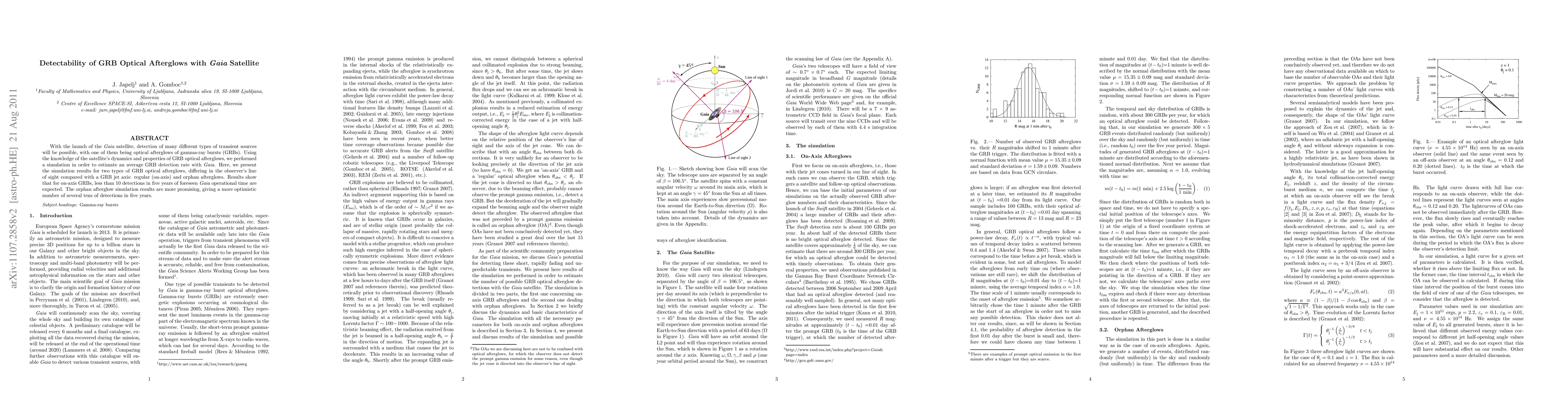 The Gaia satellite is expected to detect optical afterglows of gamma-ray bursts (GRBs), with simulations showing fewer than 10 detections for on-axis GRBs over five years, but several tens of detections for orphan afterglows.