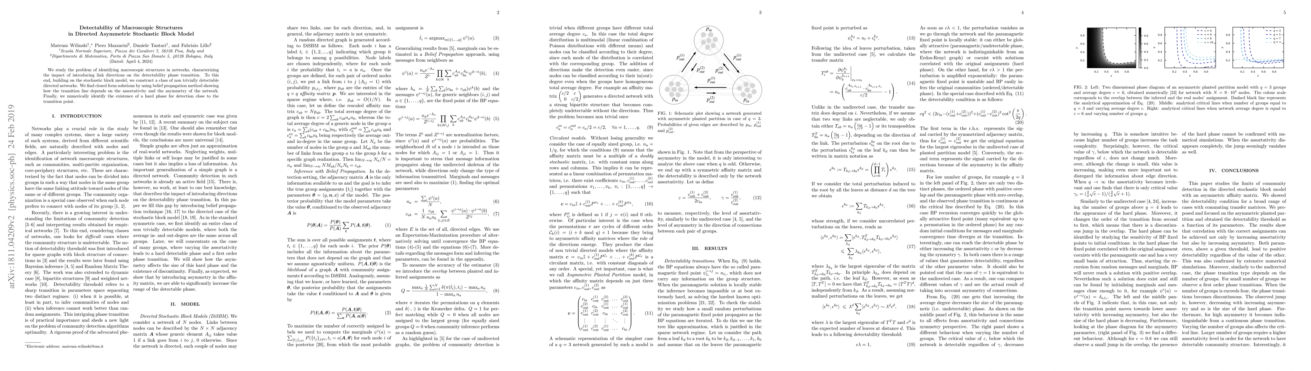This paper investigates the detectability of macroscopic structures in directed asymmetric networks using a stochastic block model, finding that link directions significantly impact the detectability phase transition. The study employs belief propagation to derive closed form solutions, revealing how assortativity and asymmetry influence the transition line.