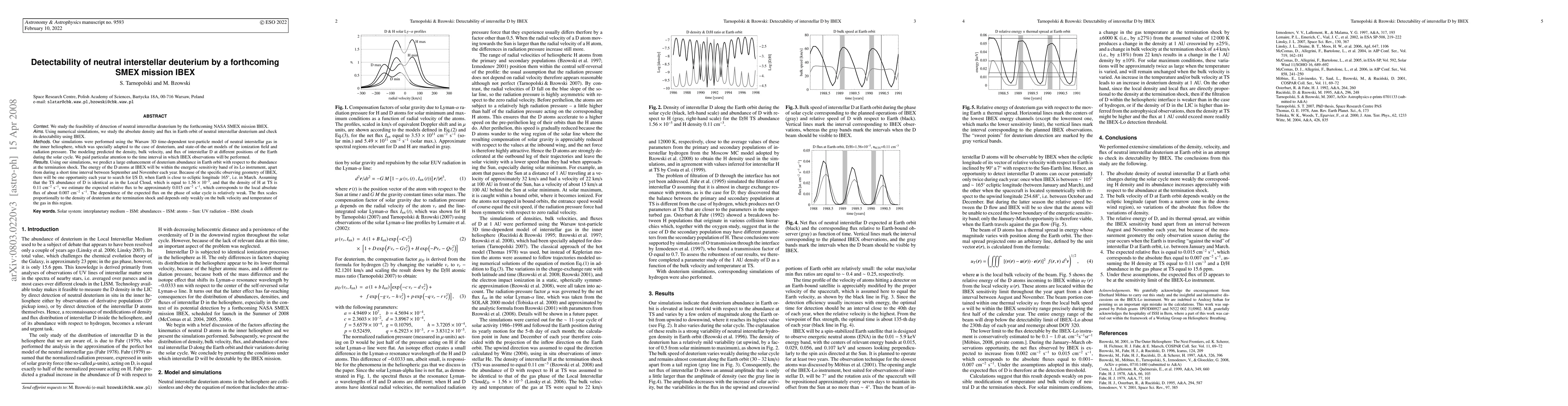 This paper investigates the detectability of interstellar neutral deuterium (D) by the forthcoming NASA IBEX mission using numerical simulations. The study predicts a significant enhancement of D abundance at Earth orbit and suggests that IBEX will detect D atoms with an expected relative flux of about 0.015/cm²/s, with one annual opportunity in February.