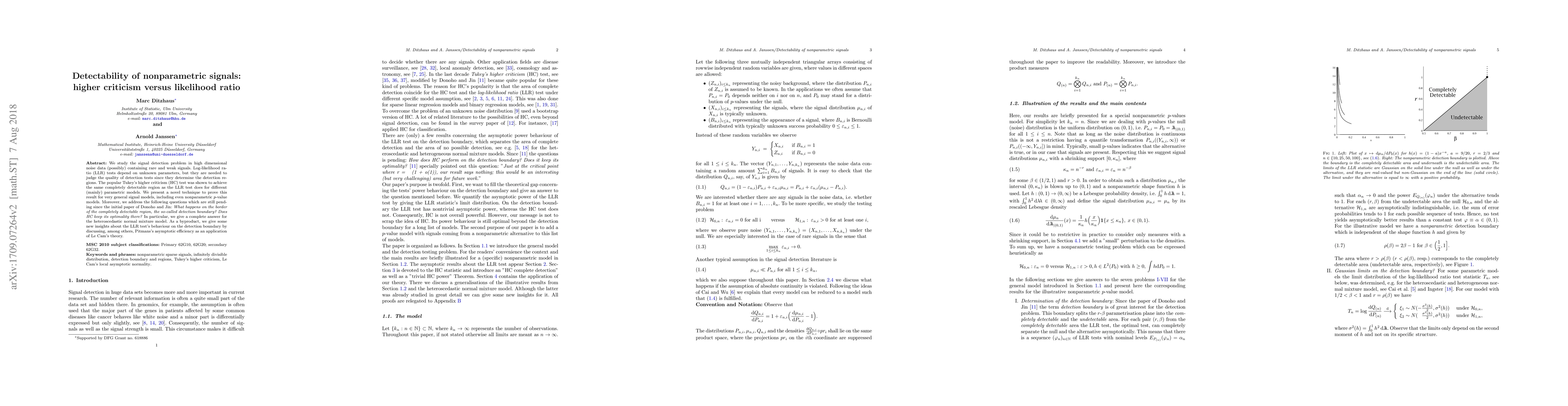 We study the signal detection problem in high dimensional noise data (possibly) containing rare and weak signals. Log-likelihood ratio (LLR) tests depend on unknown parameters, but they are needed to judge the quality of detection tests since they determine the detection regions. The popular Tukey's higher criticism (HC) test was shown to achieve the same completely detectable region as the LLR test does for different (mainly) parametric models. We present a novel technique to prove this result for very general signal models, including even nonparametric $p$-value models. Moreover, we address the following questions which are still pending since the initial paper of Donoho and Jin: What happens on the border of the completely detectable region, the so-called detection boundary? Does HC keep its optimality there? In particular, we give a complete answer for the heteroscedastic normal mixture model. As a byproduct, we give some new insights about the LLR test's behavior on the detection boundary by discussing, among others, Pitmans's asymptotic efficiency as an application of Le Cam's theory.