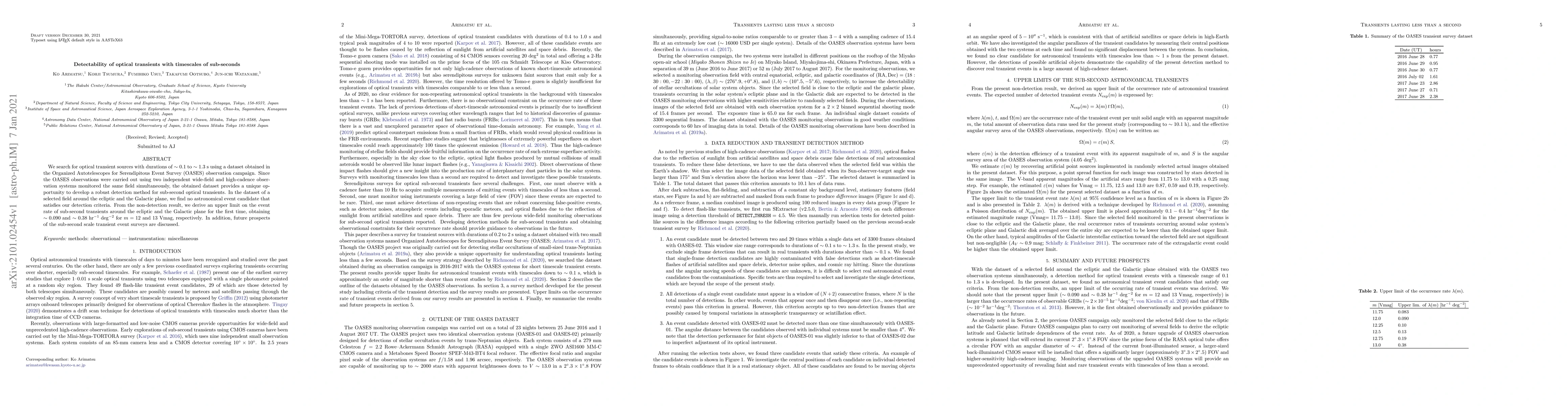 This study investigates optical transients with durations of 0.1 to 1.3 seconds using data from the OASES survey, finding no candidates that meet detection criteria. It establishes an upper limit on the event rate for such transients in the ecliptic and Galactic plane regions.