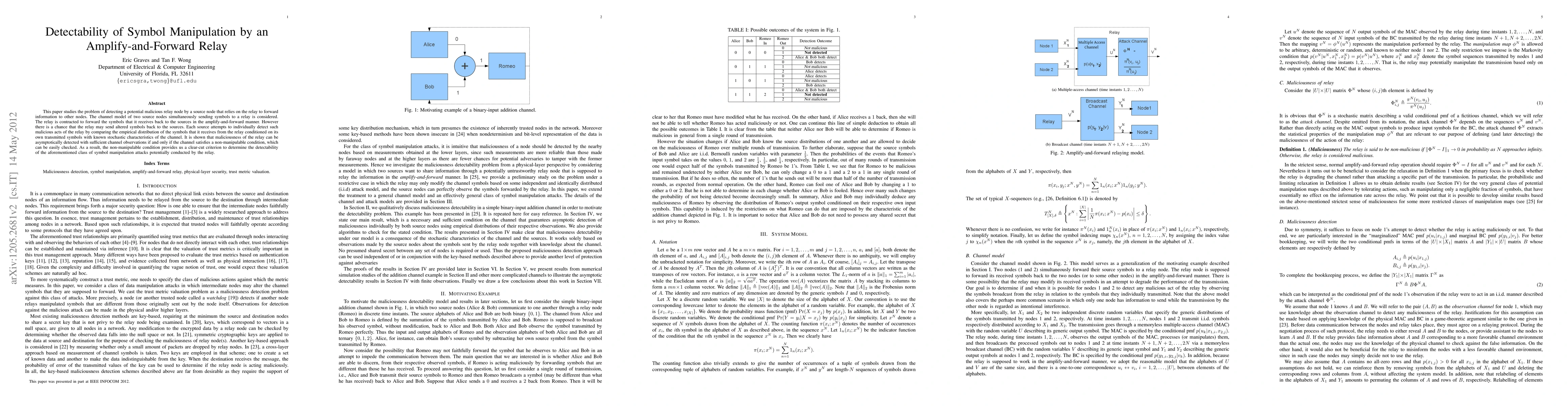 Researchers developed a method to detect symbol manipulation attacks by a relay node using amplify-and-forward relay channels. The non-manipulable condition of the channel is found to be necessary for asymptotic detection of malicious acts.