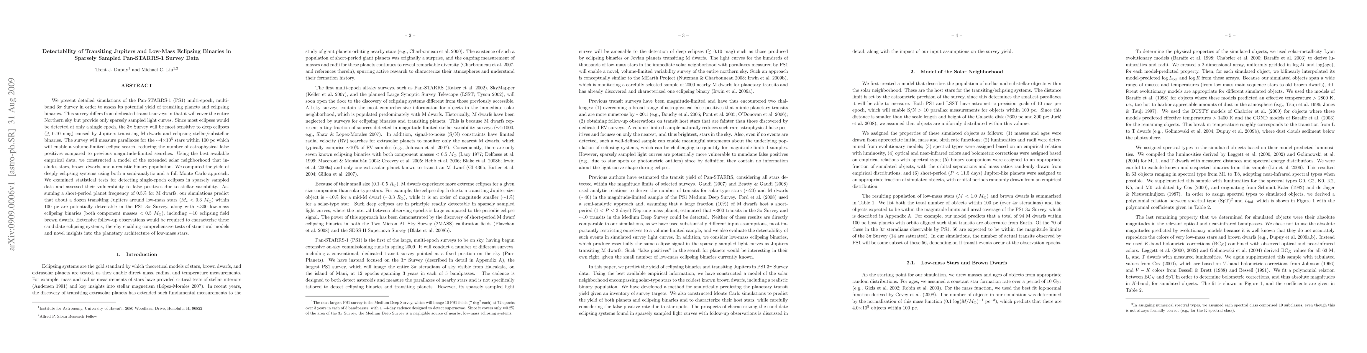 This paper simulates the Pan-STARRS-1 3-pi Survey to evaluate its ability to detect transiting Jupiters and low-mass eclipsing binaries using sparsely sampled data. The survey is expected to identify around a dozen transiting Jupiters and ~300 low-mass eclipsing binaries within 100 pc, though follow-up observations are needed to confirm these candidates.