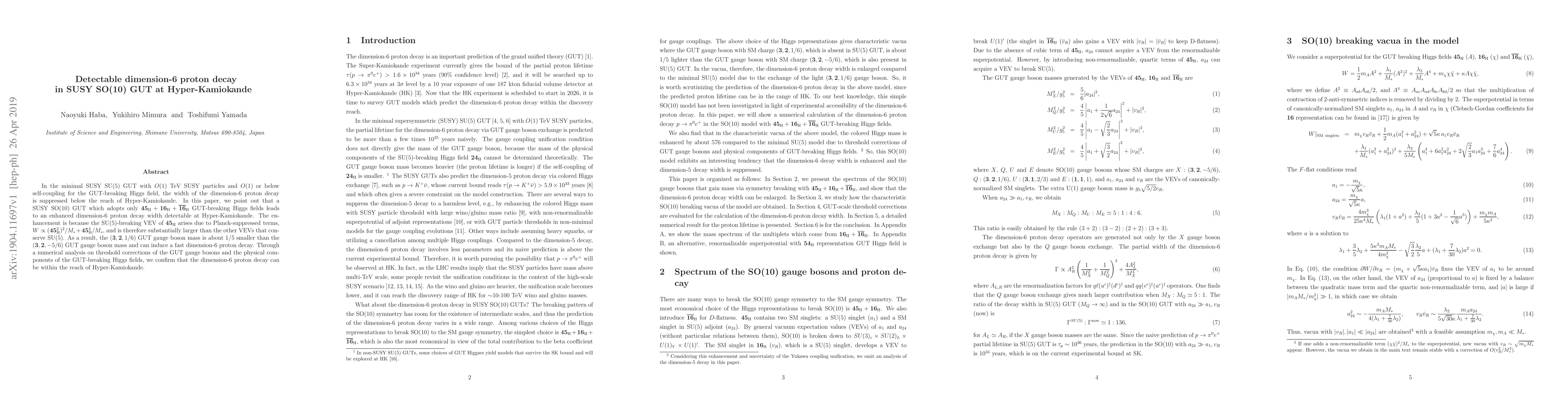 In the minimal SUSY SU(5) GUT with $O(1)$ TeV SUSY particles and $O(1)$ or below self-coupling for the GUT-breaking Higgs field, the width of the dimension-6 proton decay is suppressed below the reach of Hyper-Kamiokande. In this paper, we point out that a SUSY SO(10) GUT which adopts only ${\bf 45}_{\rm H}+{\bf 16}_{\rm H}+{\bf \overline{16}}_{\rm H}$ GUT-breaking Higgs fields leads to an enhanced dimension-6 proton decay width detectable at Hyper-Kamiokande. The enhancement is because the SU(5)-breaking VEV of ${\bf 45}_{\rm H}$ arises due to Planck-suppressed terms, $W\propto ({\bf 45}_{\rm H}^2)^2/M_*+{\bf 45}_{\rm H}^4/M_*$, and is therefore substantially larger than the other VEVs that conserve SU(5). As a result, the $({\bf 3},{\bf 2},1/6)$ GUT gauge boson mass is about $1/5$ smaller than the $({\bf 3},{\bf 2},-5/6)$ GUT gauge boson mass and can induce a fast dimension-6 proton decay. Through a numerical analysis on threshold corrections of the GUT gauge bosons and the physical components of the GUT-breaking Higgs fields, we confirm that the dimension-6 proton decay can be within the reach of Hyper-Kamiokande.