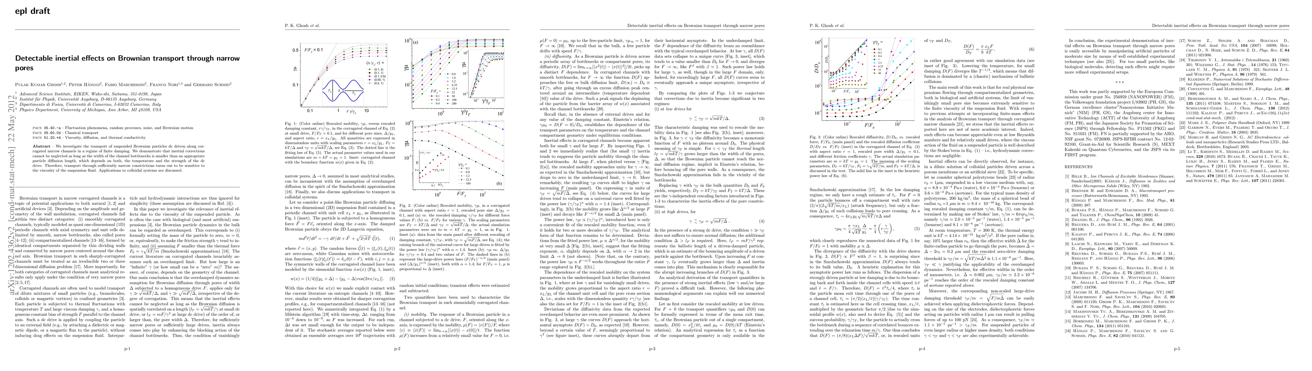 We investigate the transport of suspended Brownian particles dc driven along corrugated narrow channels in a regime of finite damping. We demonstrate that inertial corrections cannot be neglected as long as the width of the channel bottlenecks is smaller than an appropriate particle diffusion length, which depends on both, the temperature and the strength of the dc drive. Therefore, transport through sufficiently narrow constrictions turns out to be sensitive to the viscosity of the suspension fluid. Applications to colloidal systems are discussed.