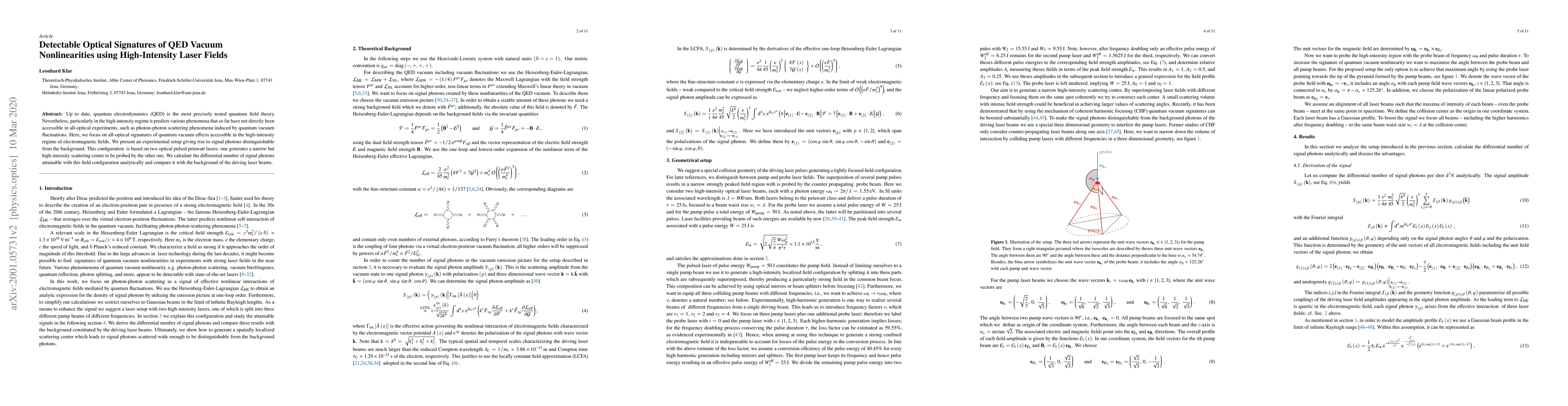 This paper explores the optical signatures of QED vacuum nonlinearities using high-intensity laser fields, focusing on photon-photon scattering phenomena induced by quantum vacuum fluctuations. The authors propose an experimental setup with two petawatt lasers to detect these effects, analytically calculating the differential number of signal photons and comparing it to the background noise.