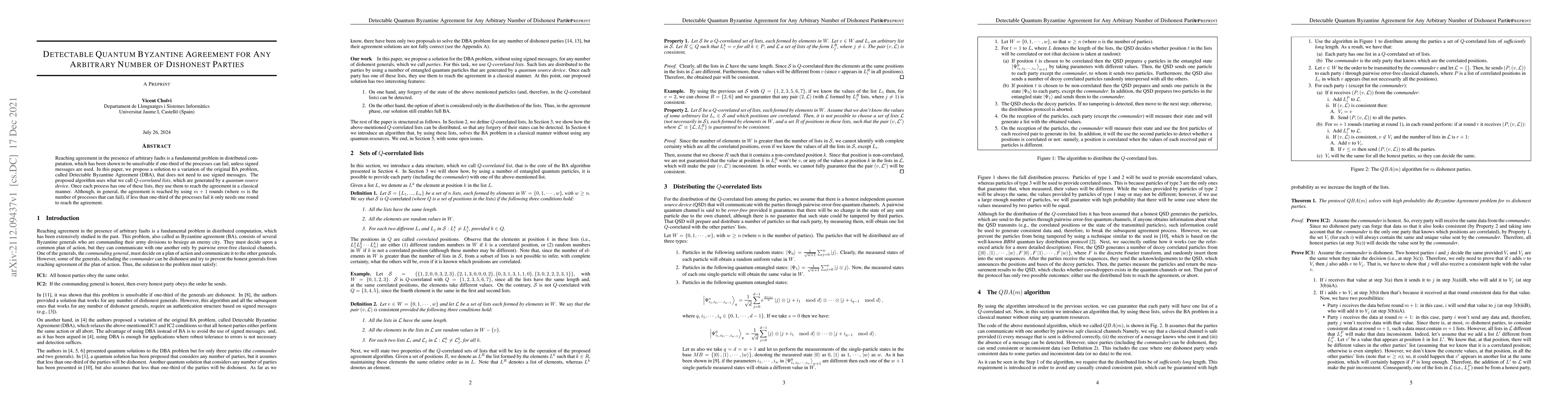 Researchers propose a new method for reaching agreement among processes with faults, called Detectable Byzantine Agreement (DBA), using quantum-correlated lists that enable agreement in one round if less than one-third of the processes fail.