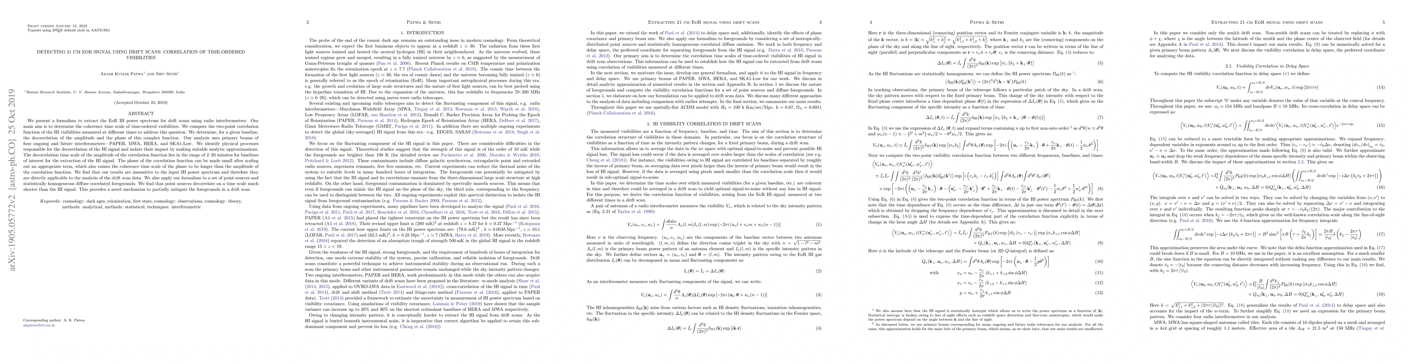We present a formalism to extract the EoR HI power spectrum for drift scans using radio interferometers. Our main aim is to determine the coherence time scale of time-ordered visibilities. We compute the two-point correlation function of the HI visibilities measured at different times to address this question. We determine, for a given baseline, the decorrelation of the amplitude and the phase of this complex function. Our analysis uses primary beams of four ongoing and future interferometers---PAPER, MWA, HERA, and SKA1-Low. We identify physical processes responsible for the decorrelation of the HI signal and isolate their impact by making suitable analytic approximations. The decorrelation time scale of the amplitude of the correlation function lies in the range of 2--20~minutes for baselines of interest for the extraction of the HI signal. The phase of the correlation function can be made small after scaling out an appropriate term, which also causes the coherence time scale of the phase to be longer than the amplitude of the correlation function. We find that our results are insensitive to the input HI power spectrum and therefore they are directly applicable to the analysis of the drift scan data. We also apply our formalism to a set of point sources and statistically homogeneous diffuse correlated foregrounds. We find that point sources decorrelate on a time scale much shorter than the HI signal. This provides a novel mechanism to partially mitigate the foregrounds in a drift scan.
