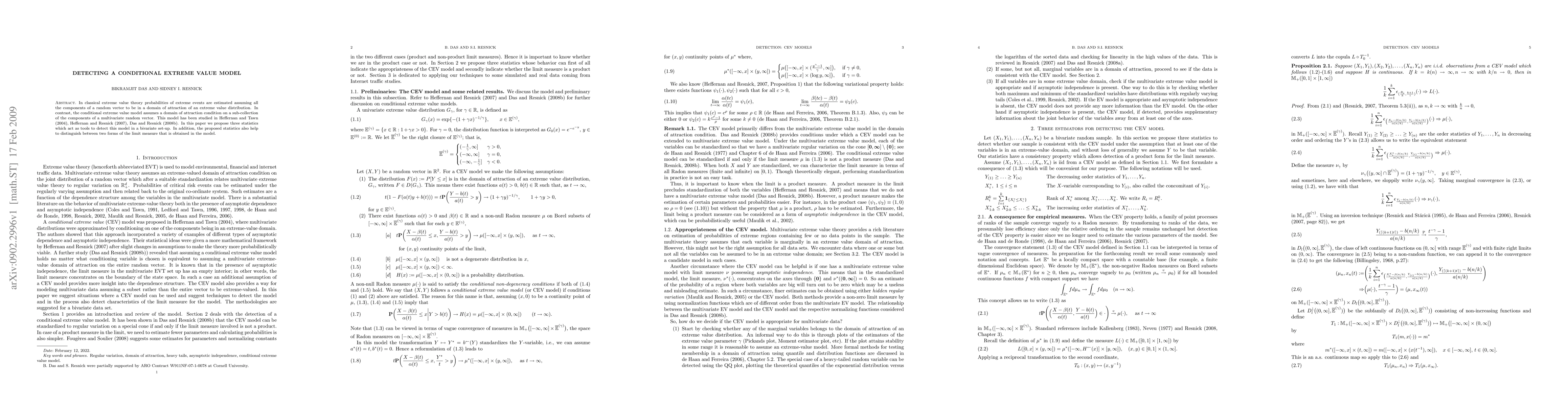 In classical extreme value theory probabilities of extreme events are estimated assuming all the components of a random vector to be in a domain of attraction of an extreme value distribution. In contrast, the conditional extreme value model assumes a domain of attraction condition on a sub-collection of the components of a multivariate random vector. This model has been studied in \cite{heffernan:tawn:2004,heffernan:resnick:2007,das:resnick:2008a}. In this paper we propose three statistics which act as tools to detect this model in a bivariate set-up. In addition, the proposed statistics also help to distinguish between two forms of the limit measure that is obtained in the model.