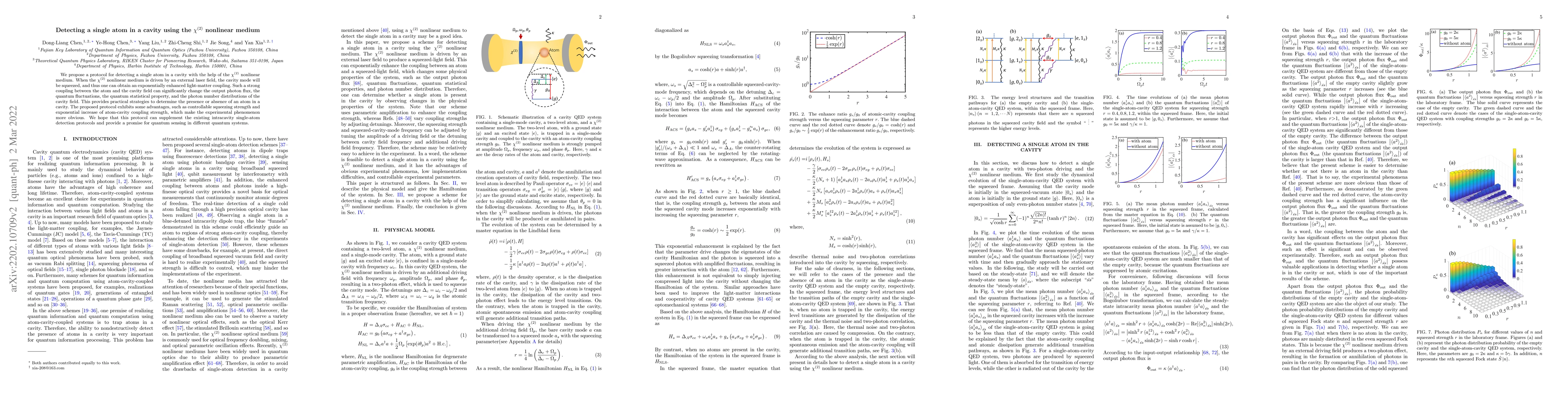 This research proposes a novel protocol for detecting a single atom within a cavity using a $\chi^{(2)}$ nonlinear medium, leveraging squeezed cavity modes to exponentially enhance light-matter coupling. The method offers controllable squeezing strength and increased atom-cavity coupling, aiding in clear identification of atom presence.
