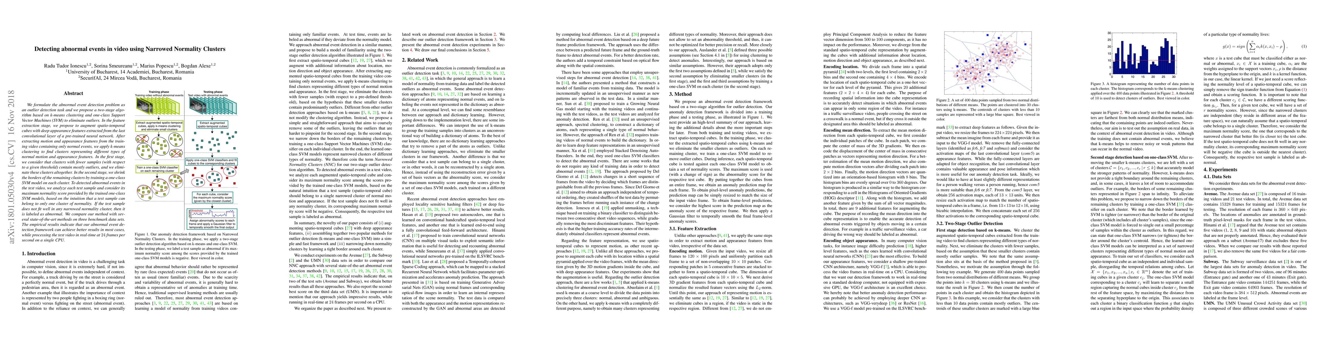 This paper proposes a two-stage algorithm for detecting abnormal events in video using k-means clustering and one-class SVMs. It extracts deep features and narrows normality clusters to identify outliers, achieving better performance compared to state-of-the-art methods while maintaining real-time processing speed.