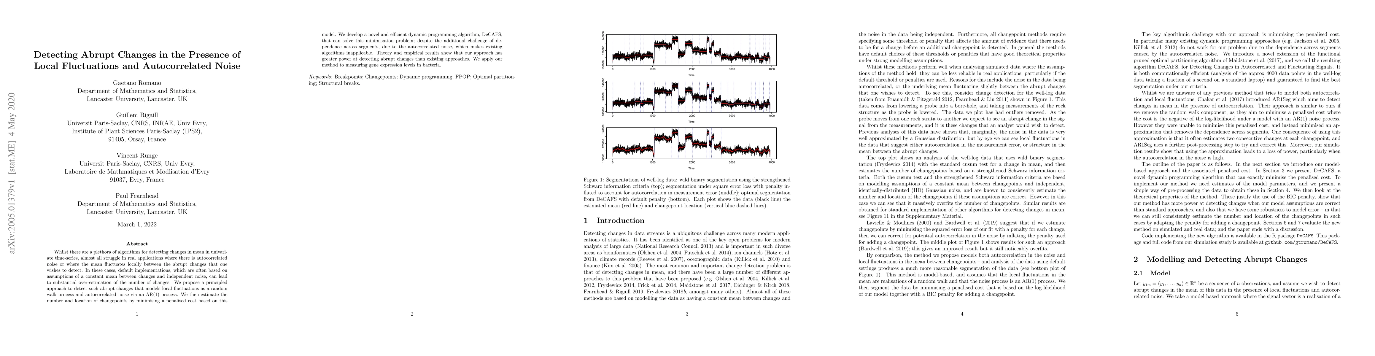 This paper proposes a novel method, DeCAFS, to detect abrupt changes in time-series data with autocorrelated noise and local fluctuations, addressing limitations of existing algorithms. The method models local fluctuations and noise, then uses dynamic programming to minimize a penalized cost function, demonstrating greater detection power in both theory and empirical tests, including its application to gene expression data in bacteria.