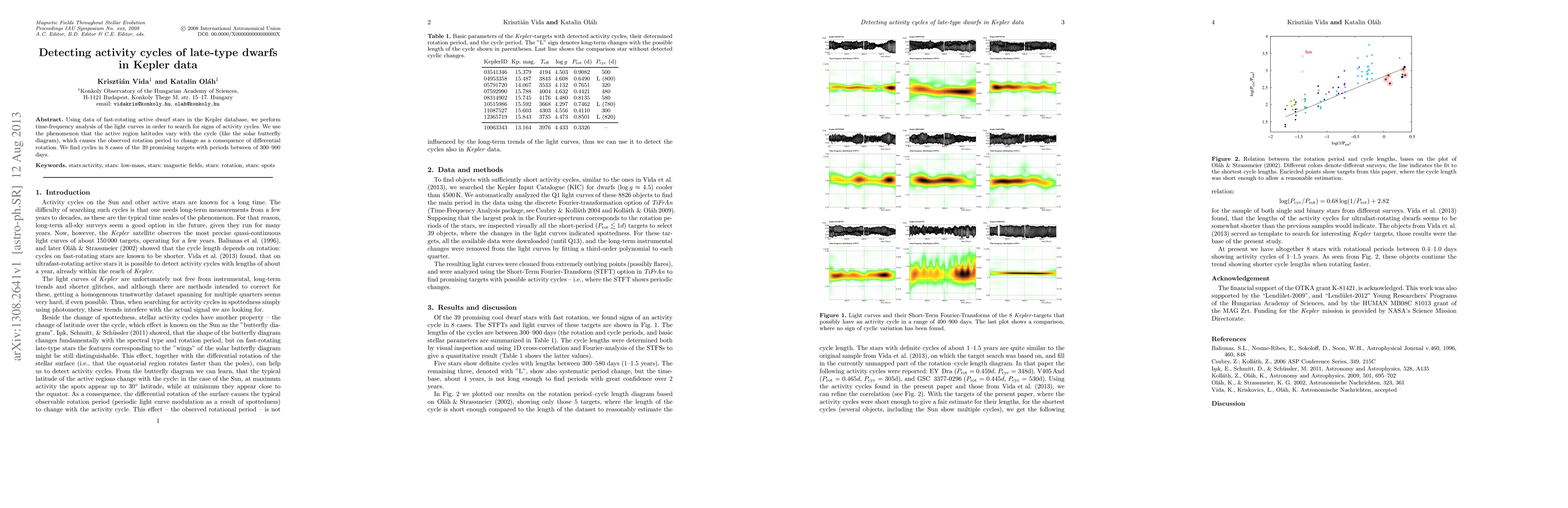 This study employs time-frequency analysis on Kepler data to detect activity cycles in fast-rotating late-type dwarf stars, identifying cycles in 8 out of 39 targets with periods ranging from 300 to 900 days, due to varying active region latitudes.
