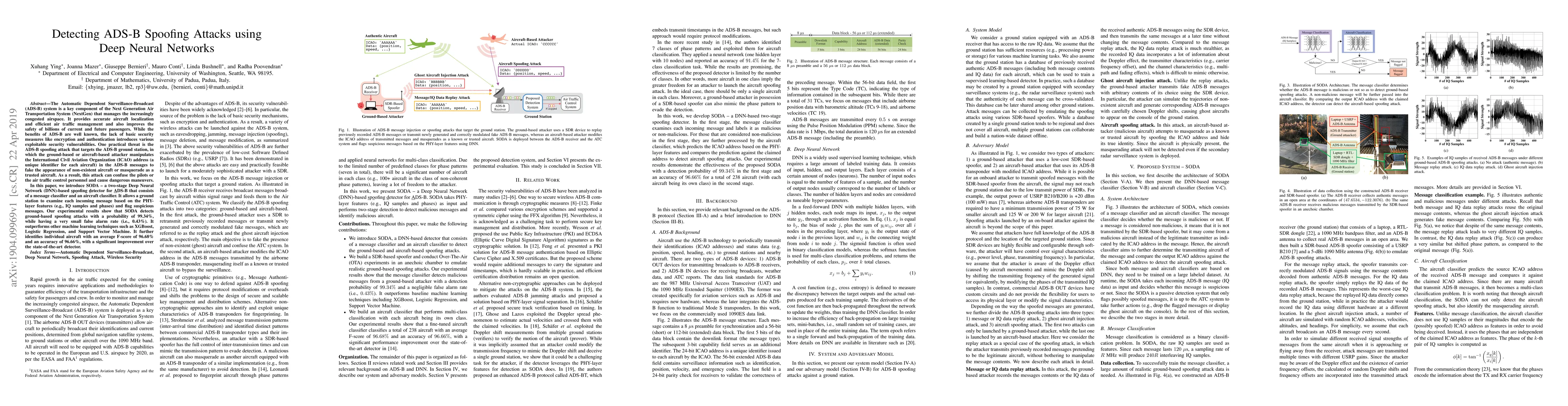 This research introduces SODA, a Deep Neural Network-based system that detects ADS-B spoofing attacks with high accuracy. It classifies messages and aircraft, outperforming traditional methods with a 99.34% detection rate for spoofed messages and 96.66% accuracy in aircraft identification.