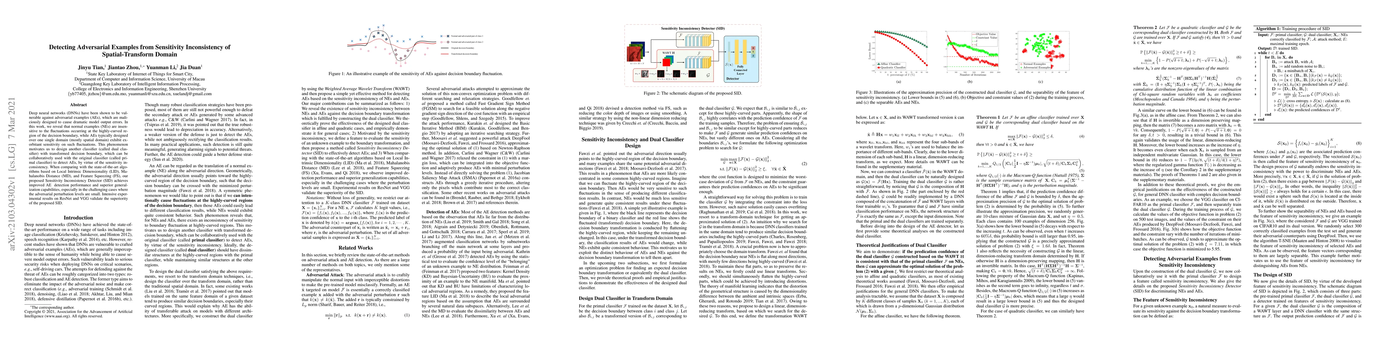 This paper proposes a Sensitivity Inconsistency Detector (SID) to detect adversarial examples by leveraging the inconsistency in sensitivity between normal and adversarial examples in the spatial-transform domain. The dual classifier, designed with a transformed decision boundary, enhances the detection of adversarial examples, outperforming state-of-the-art methods in challenging scenarios with small perturbation levels.