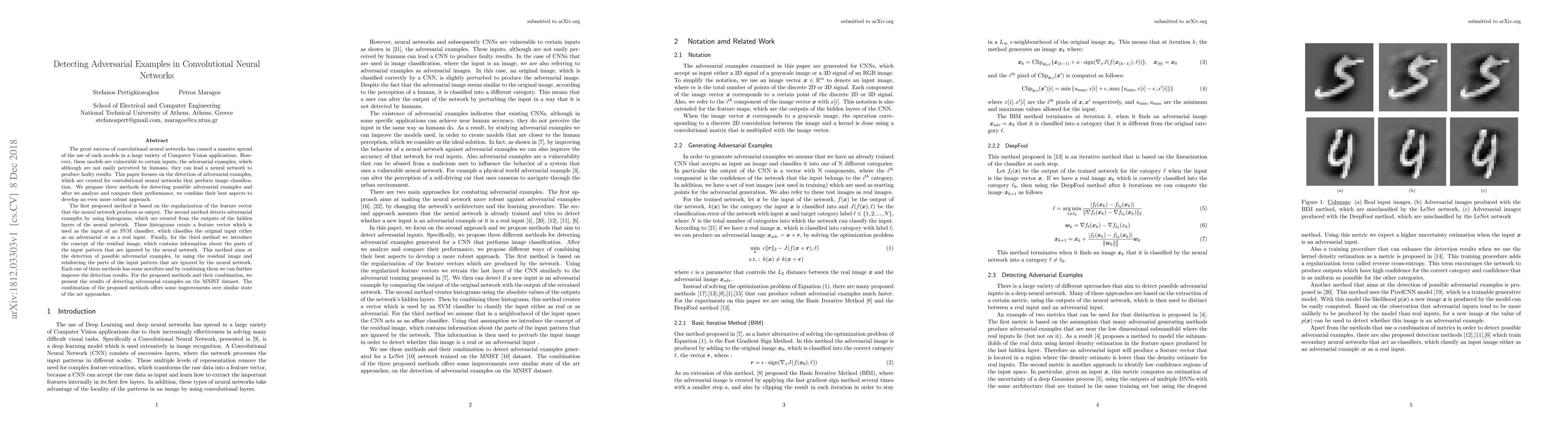This paper proposes three methods to detect adversarial examples in convolutional neural networks used for image classification, including regularization of feature vectors, histogram-based feature extraction, and residual image analysis. By combining the best aspects of these methods, the authors develop a more robust detection approach, demonstrating improved performance on the MNIST dataset compared to state-of-the-art techniques.