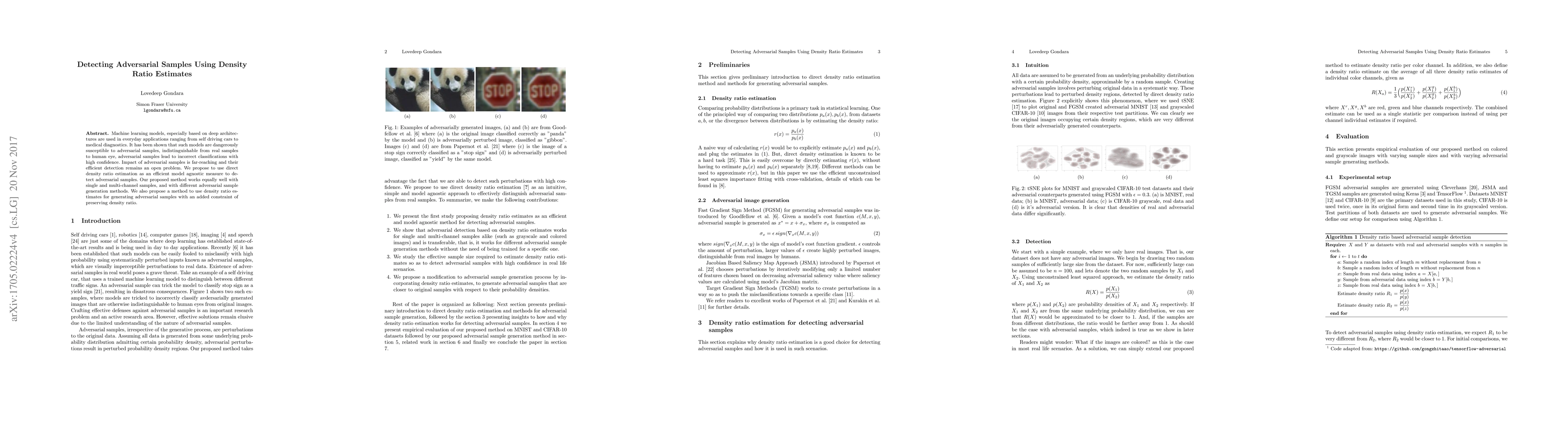 Machine learning models, especially based on deep architectures are used in everyday applications ranging from self driving cars to medical diagnostics. It has been shown that such models are dangerously susceptible to adversarial samples, indistinguishable from real samples to human eye, adversarial samples lead to incorrect classifications with high confidence. Impact of adversarial samples is far-reaching and their efficient detection remains an open problem. We propose to use direct density ratio estimation as an efficient model agnostic measure to detect adversarial samples. Our proposed method works equally well with single and multi-channel samples, and with different adversarial sample generation methods. We also propose a method to use density ratio estimates for generating adversarial samples with an added constraint of preserving density ratio.