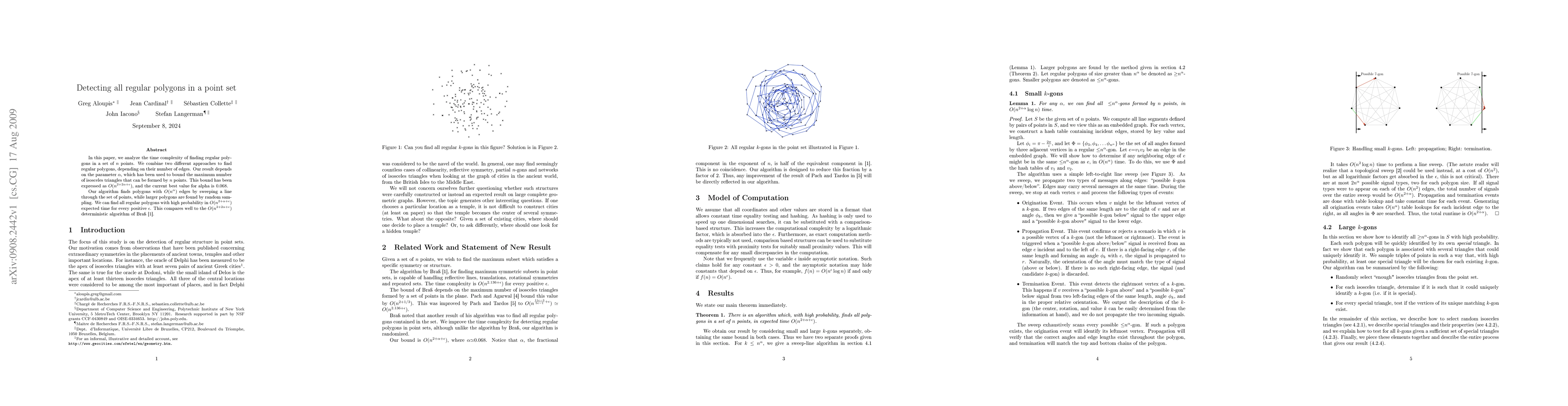 This paper presents an efficient algorithm for detecting all regular polygons in a set of n points, achieving O(n^{2+alpha+epsilon}) expected time complexity. It combines line sweeping for small polygons and random sampling for larger ones, outperforming Brass's O(n^{2+2alpha+epsilon}) deterministic method.