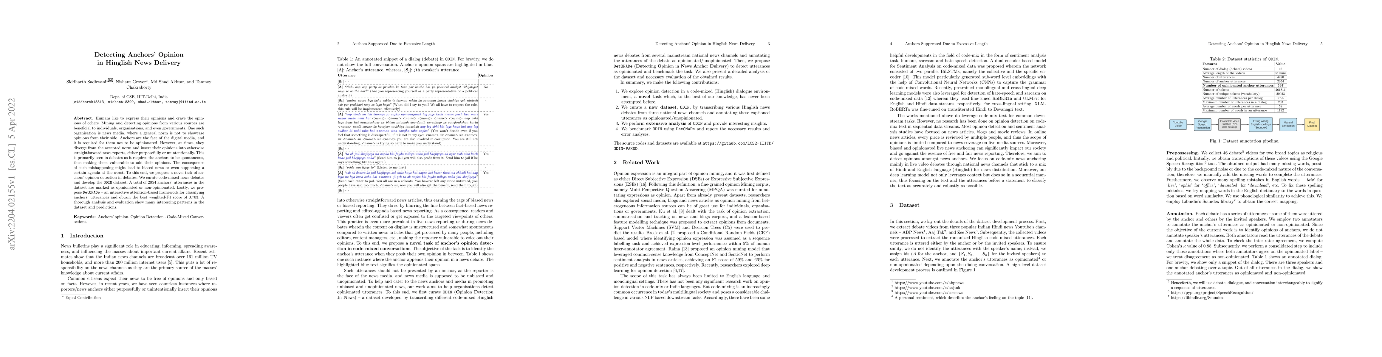 Humans like to express their opinions and crave the opinions of others. Mining and detecting opinions from various sources are beneficial to individuals, organisations, and even governments. One such organisation is news media, where a general norm is not to showcase opinions from their side. Anchors are the face of the digital media, and it is required for them not to be opinionated. However, at times, they diverge from the accepted norm and insert their opinions into otherwise straightforward news reports, either purposefully or unintentionally. This is primarily seen in debates as it requires the anchors to be spontaneous, thus making them vulnerable to add their opinions. The consequence of such mishappening might lead to biased news or even supporting a certain agenda at the worst. To this end, we propose a novel task of anchors' opinion detection in debates. We curate code-mixed news debates and develop the ODIN dataset. A total of 2054 anchors' utterances in the dataset are marked as opinionated or non-opinionated. Lastly, we propose DetONADe, an interactive attention-based framework for classifying anchors' utterances and obtain the best weighted-F1 score of 0.703. A thorough analysis and evaluation show many interesting patterns in the dataset and predictions.