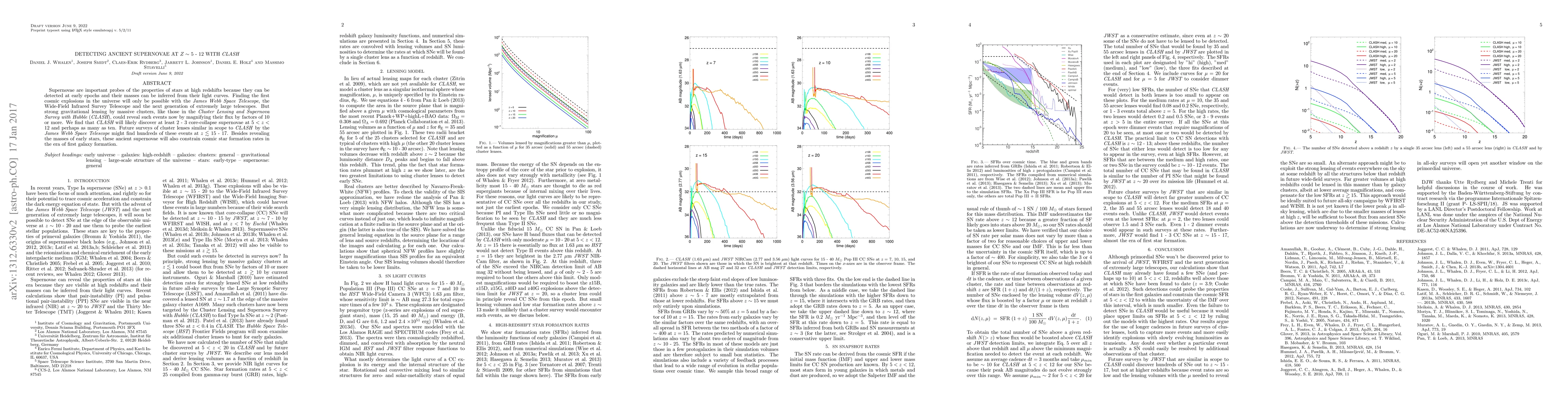 This paper discusses the potential of the CLASH project to detect ancient supernovae at redshifts z ~ 5 - 12 through strong gravitational lensing, predicting the discovery of 2-10 core-collapse supernovae. Future surveys with the James Webb Space Telescope could find hundreds of these events, providing insights into early star formation and cosmic star formation rates.