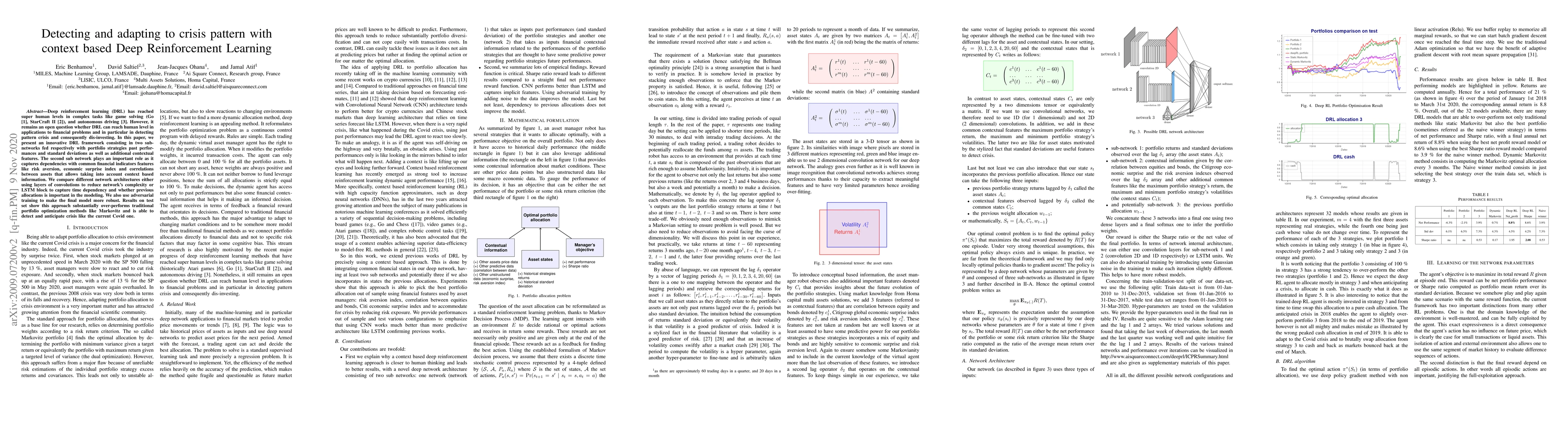 Deep reinforcement learning (DRL) has reached super human levels in complex tasks like game solving (Go and autonomous driving). However, it remains an open question whether DRL can reach human level in applications to financial problems and in particular in detecting pattern crisis and consequently dis-investing. In this paper, we present an innovative DRL framework consisting in two sub-networks fed respectively with portfolio strategies past performances and standard deviations as well as additional contextual features. The second sub network plays an important role as it captures dependencies with common financial indicators features like risk aversion, economic surprise index and correlations between assets that allows taking into account context based information. We compare different network architectures either using layers of convolutions to reduce network's complexity or LSTM block to capture time dependency and whether previous allocations is important in the modeling. We also use adversarial training to make the final model more robust. Results on test set show this approach substantially over-performs traditional portfolio optimization methods like Markowitz and is able to detect and anticipate crisis like the current Covid one.